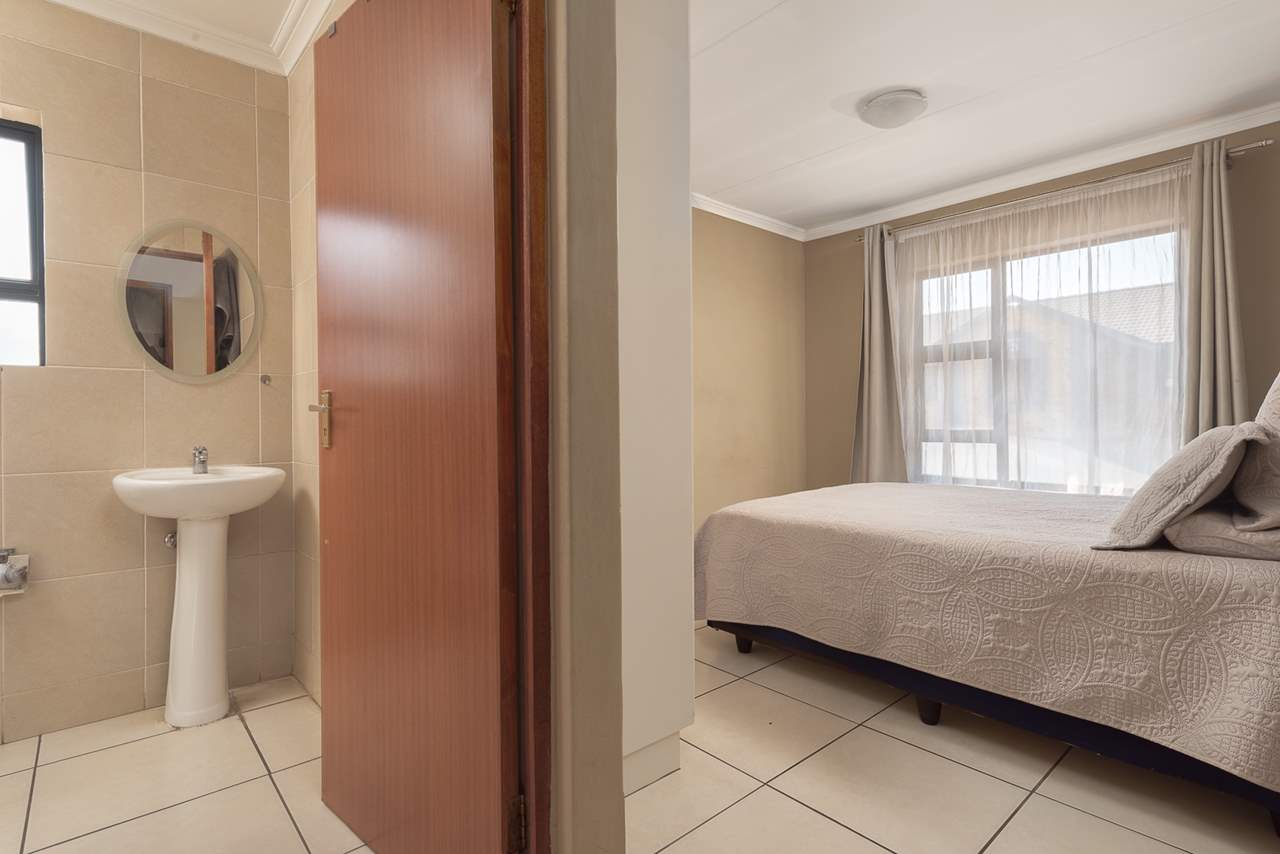 Three spacious bedrooms, each with tiled floors and built-in cupboards, offer a modern, low-maintenance lifestyle. The two bathrooms are beautifully finished in soothing earthy tones — with a full main bathroom and a private en-suite shower for the main bedroom.