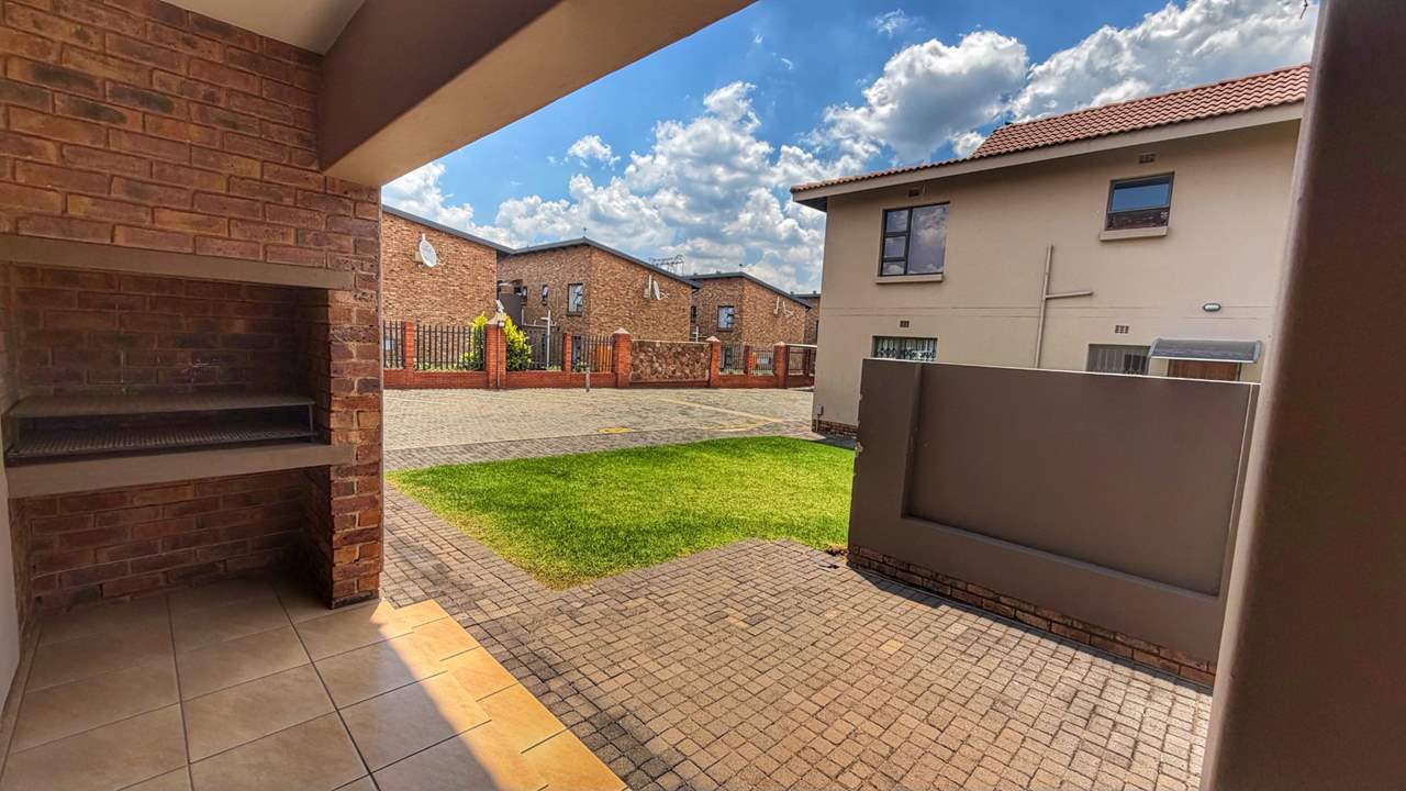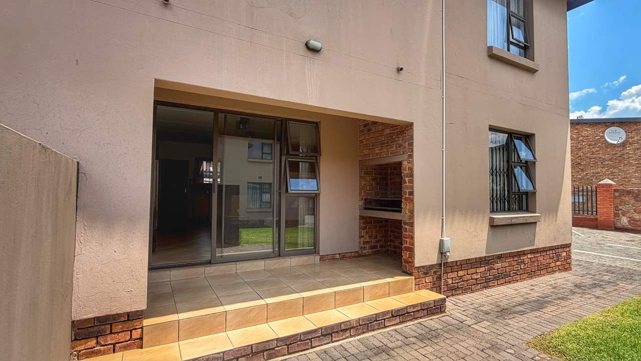 The apartment is fully tiled throughout except for the bedrooms which have laminated flooring and features a bright open-plan lounge and modern kitchen, designed for comfortable everyday living. Sliding doors lead from the lounge onto a covered patio with a built-in braai, plus extra outdoor space – perfect for a garden set and relaxed outdoor entertaining.