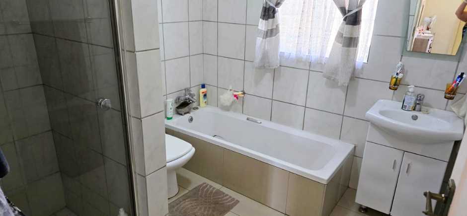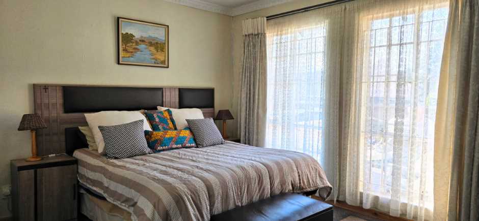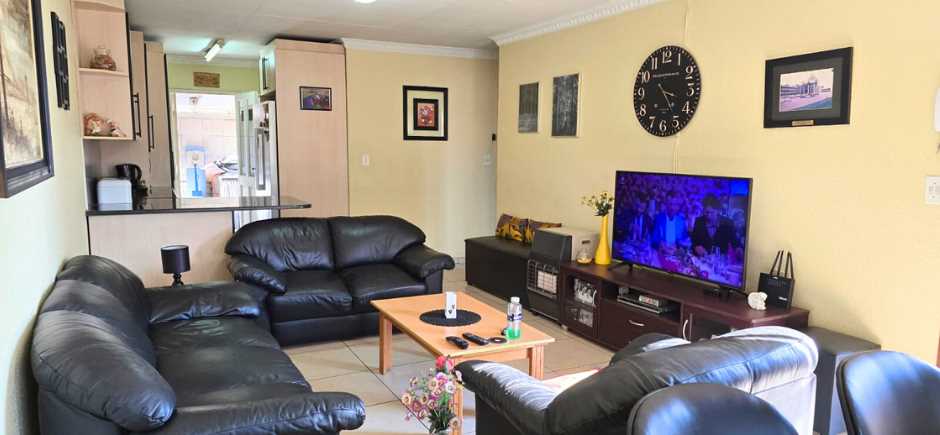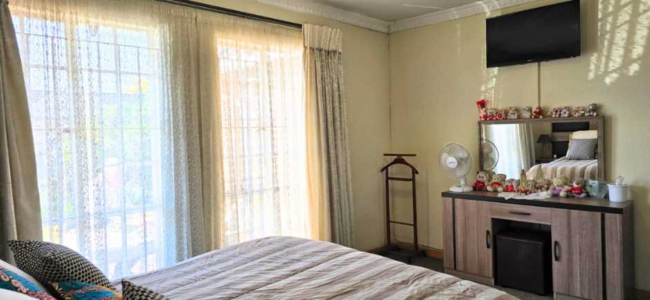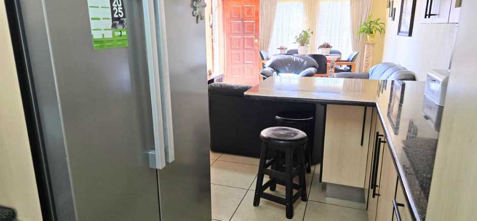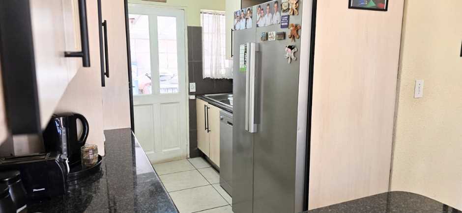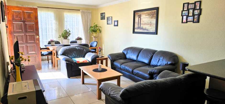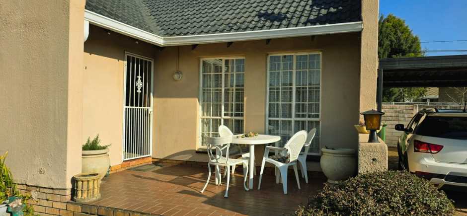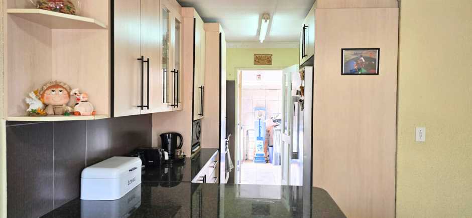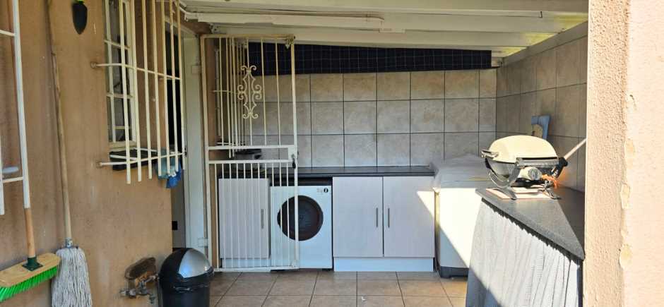 The home’s layout extends to an enclosed back patio, fully fitted as a laundry and covered braai area—perfect for year-round entertaining.