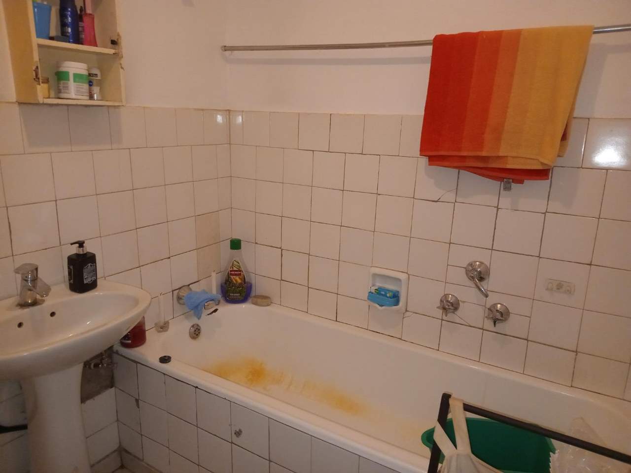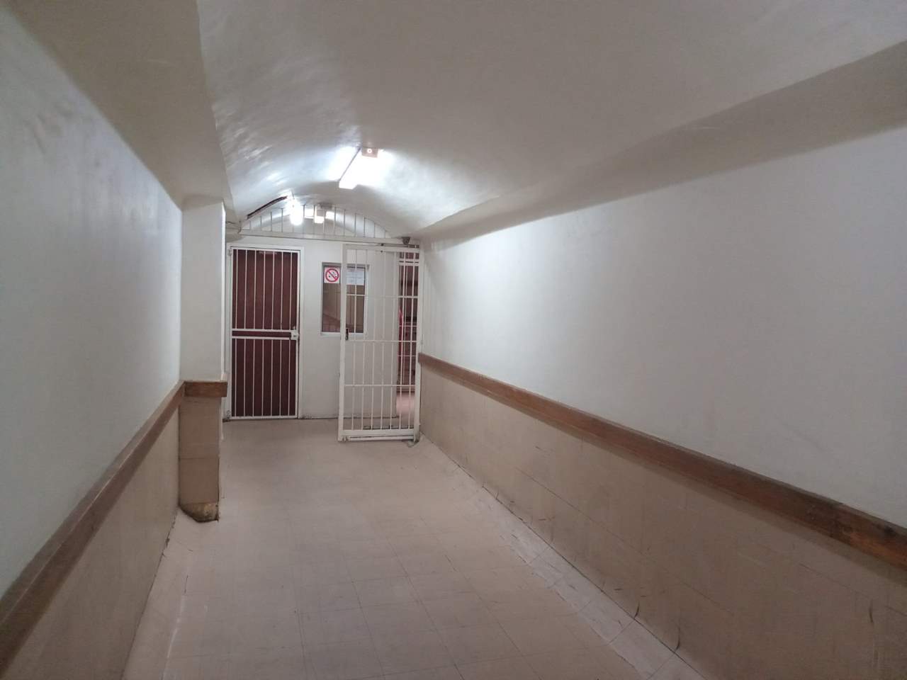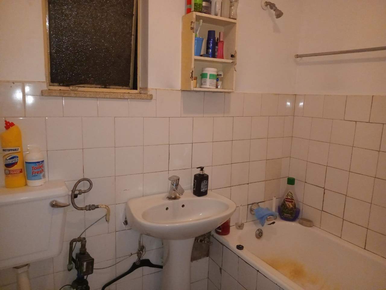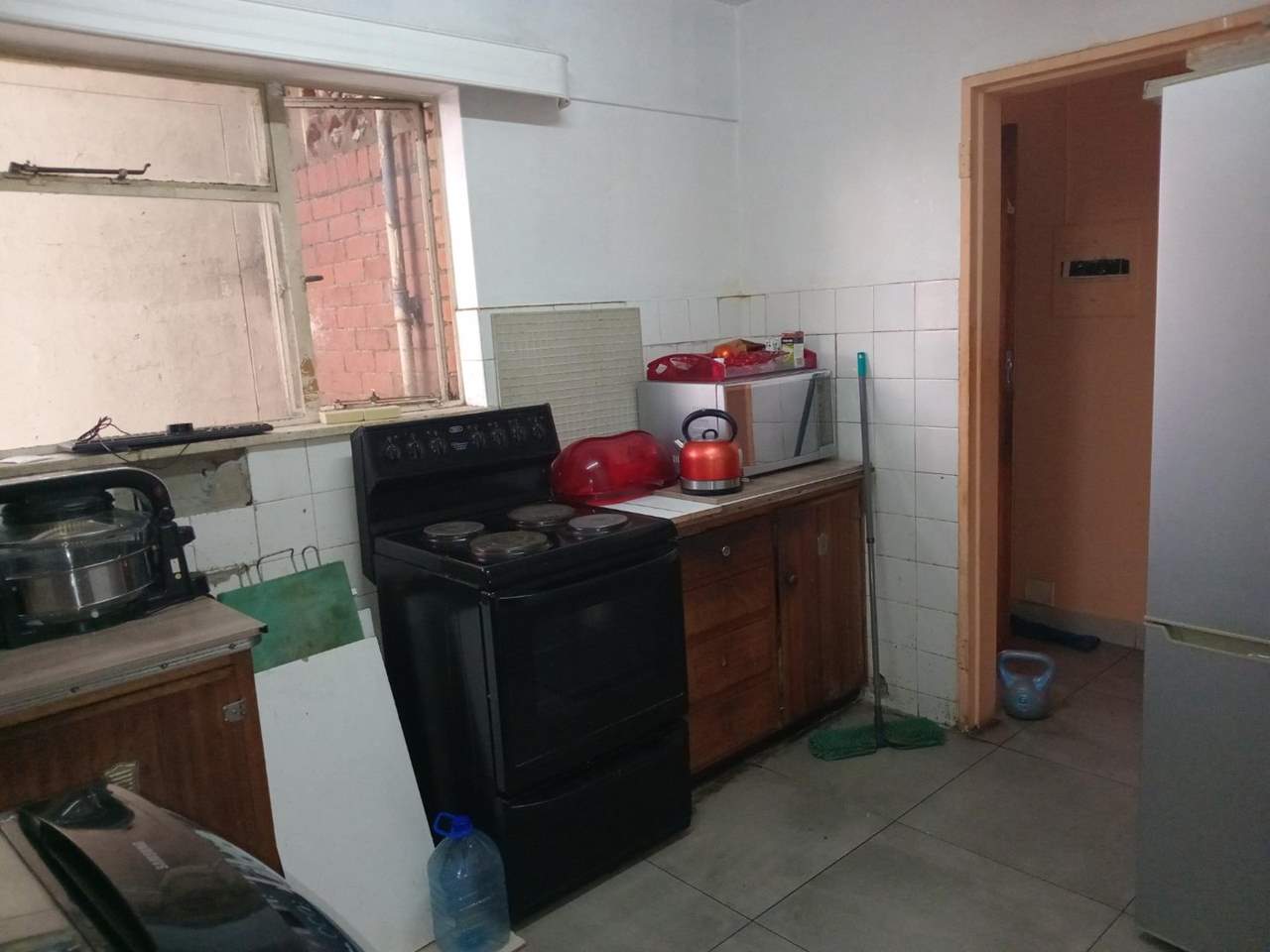 The apartment boasts a fully tiled interior and includes a compact yet functional kitchen, a bathroom with a bath, basin, and toilet-