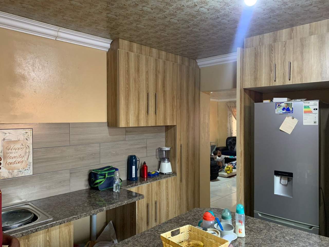 The house features four spacious bedrooms, two bathrooms, and an open-plan living and dining area with beautiful tiles. The modern kitchen is equipped with ample storage space and a stove, perfect for cooking up a storm.