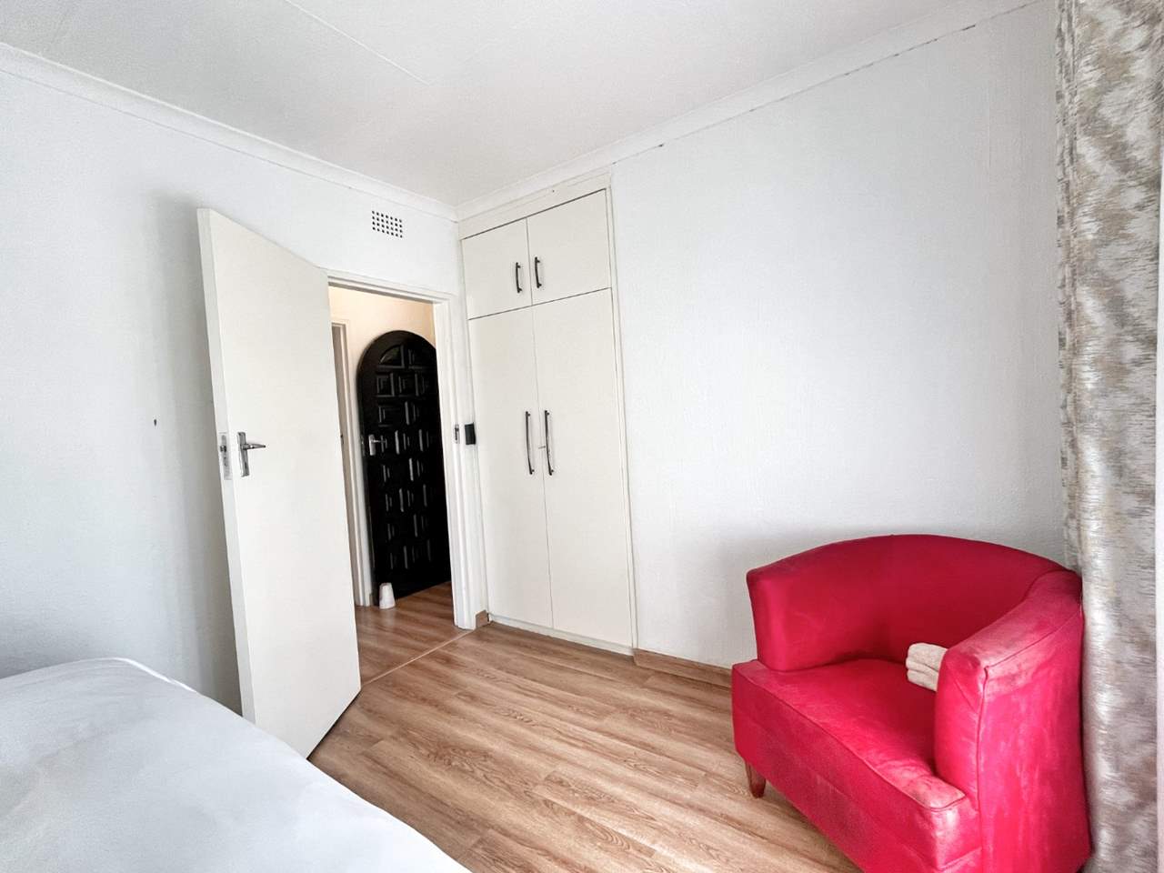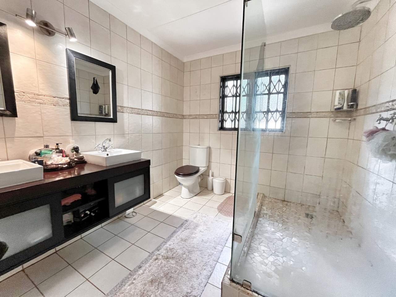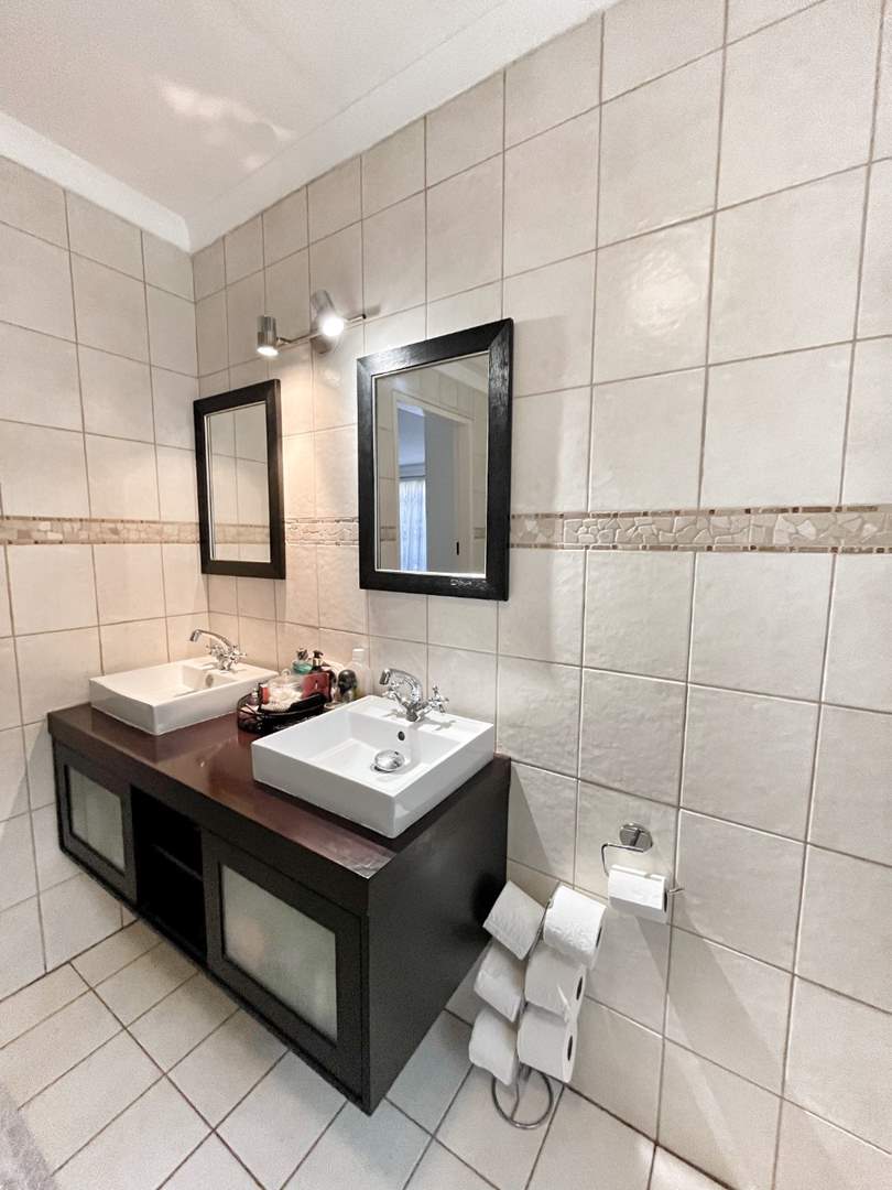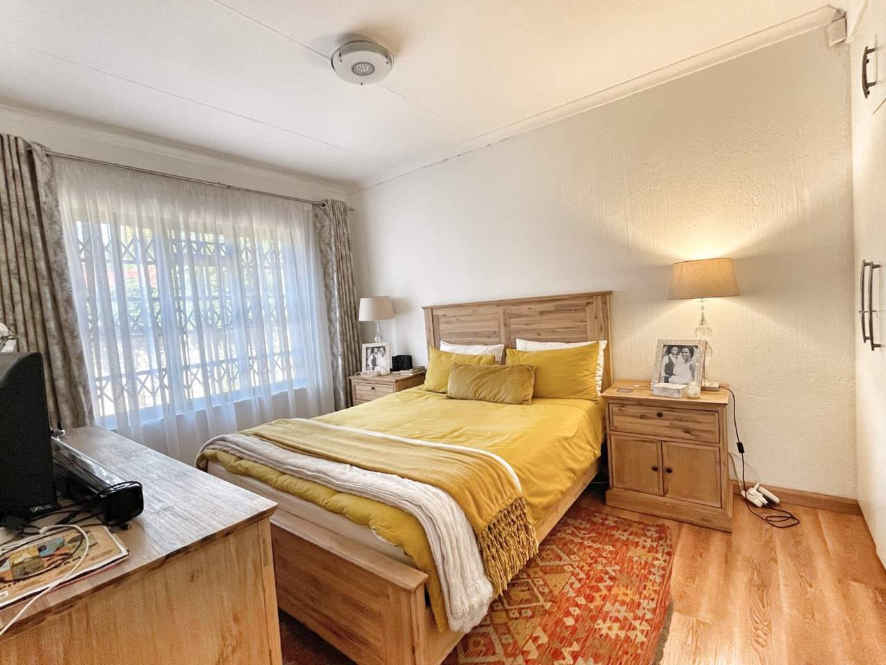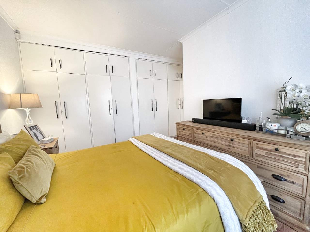 The third bedroom, tucked away at the back of the home, offers privacy and comfort, complete with a modern en-suite bathroom, ample cupboard space, and its own private lounge opening onto the garden and pool area.