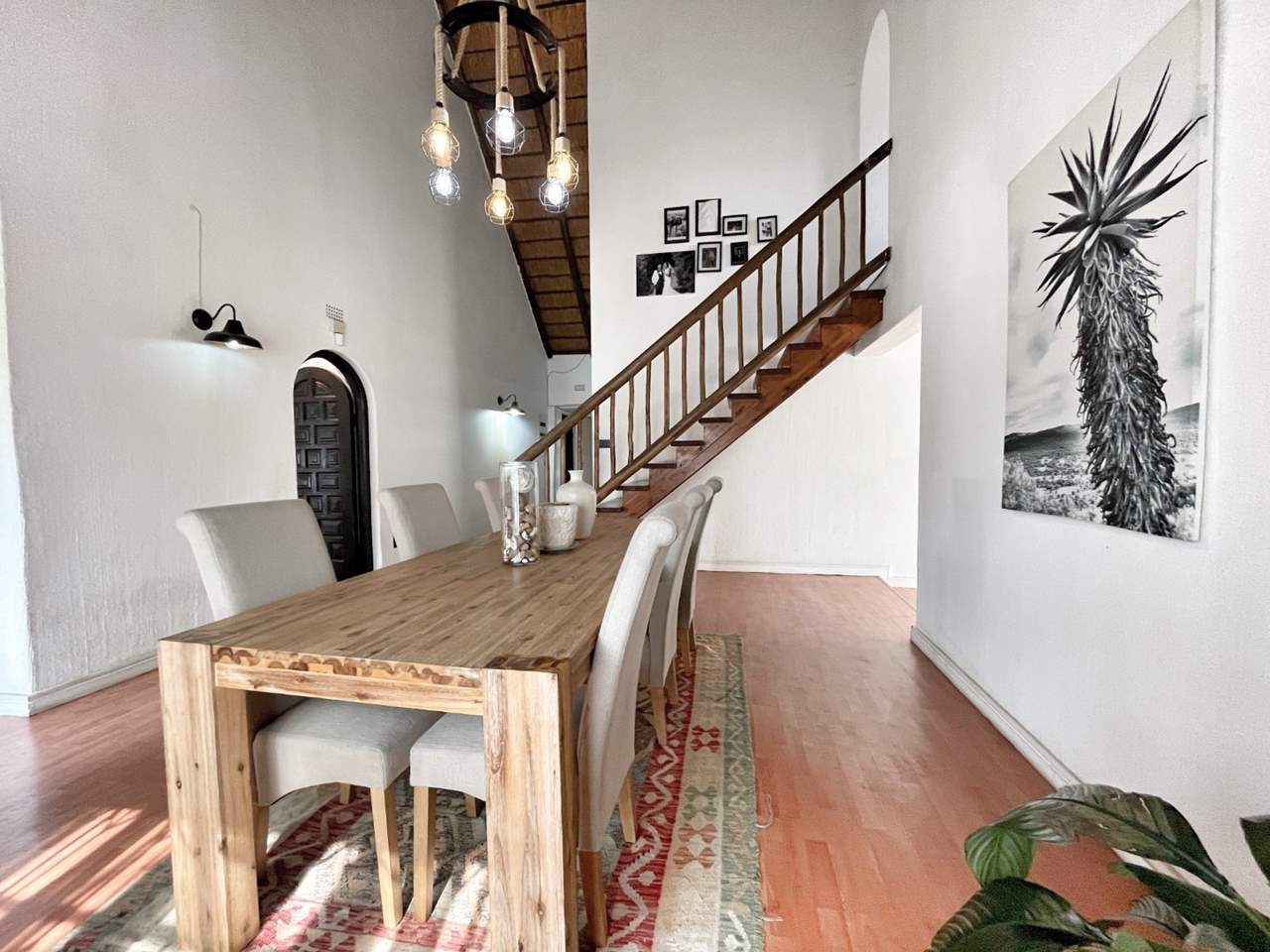 As you enter, the soaring thatch ceilings and beautiful staircase immediately impress, creating a warm and spacious ambiance. The upstairs loft area can be used as a study, lounge, or even a fourth bedroom, and leads out to a balcony overlooking the garden and pool—a peaceful spot to unwind.