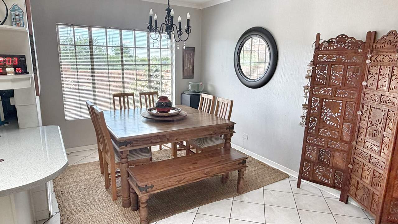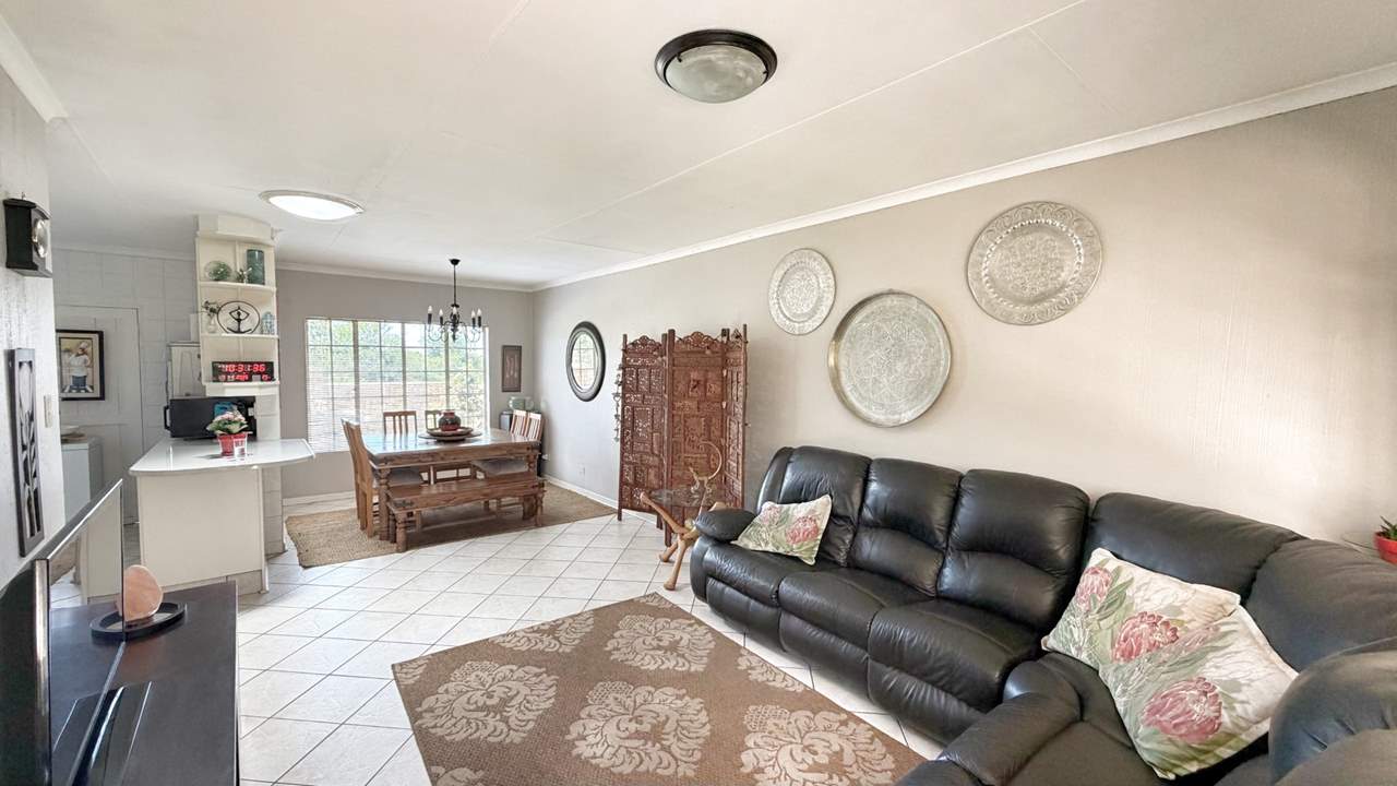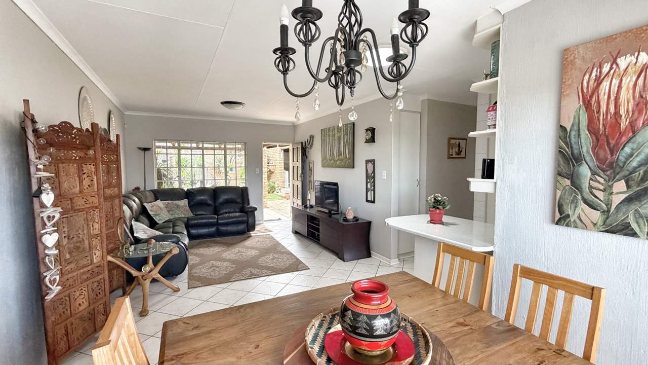 Flooded with natural light and fitted with blinds throughout, the home welcomes you into a spacious open-plan lounge and dining area that flows seamlessly onto a covered patio with shade net, perfect for relaxed outdoor living. A well-established garden with large paved areas and pet-friendly layout completes the picture of easy, low-upkeep living.