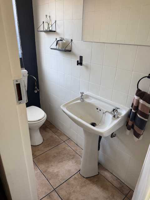 The home has a guest toilet on your way to the 3 bedrooms and 2 bathrooms upstairs .