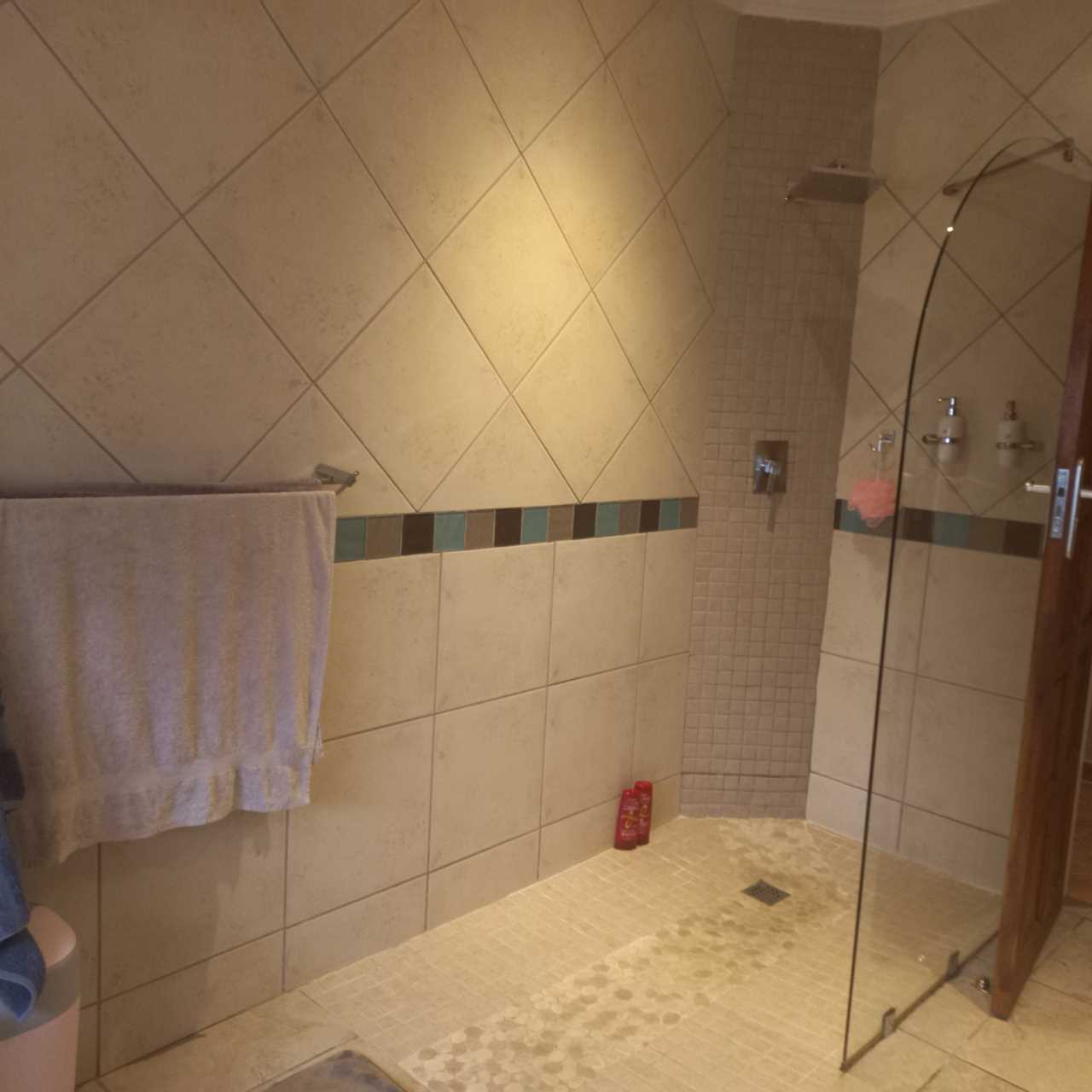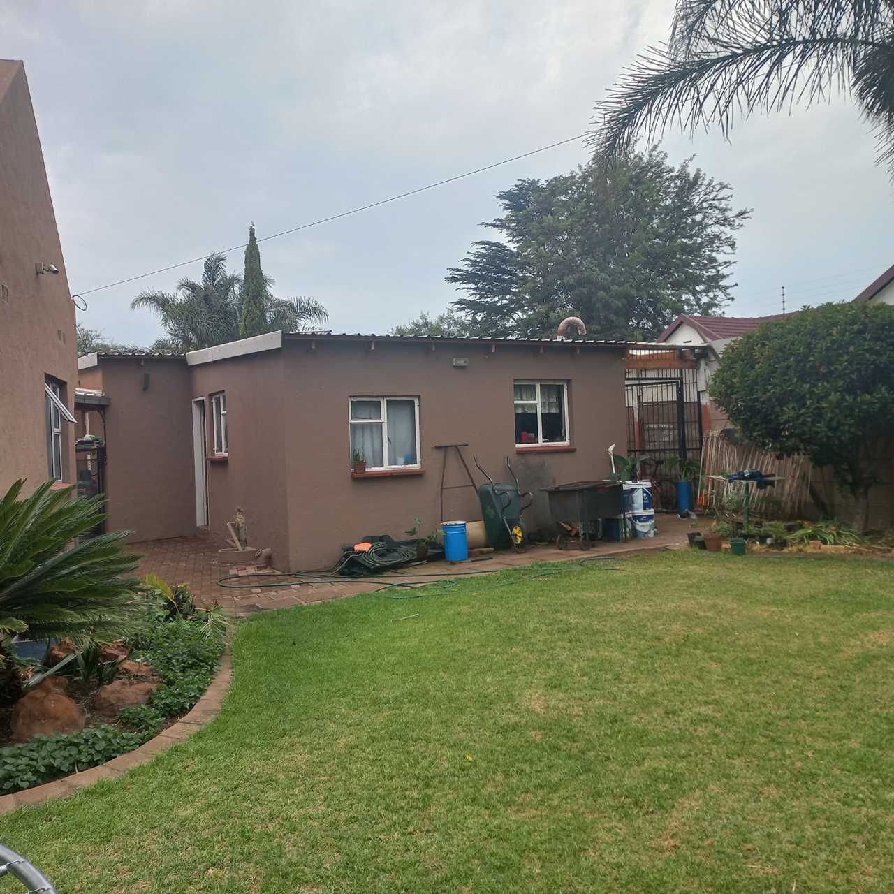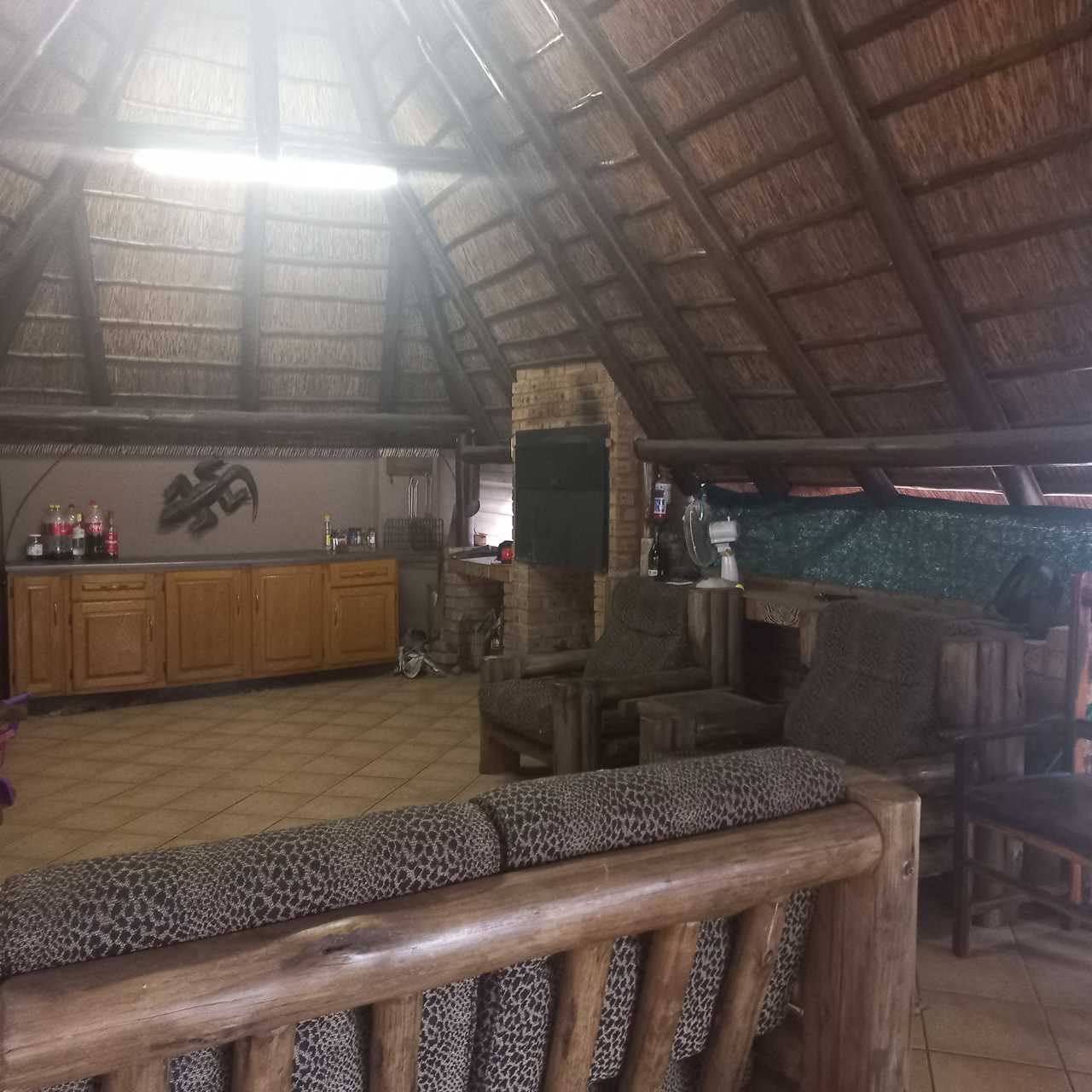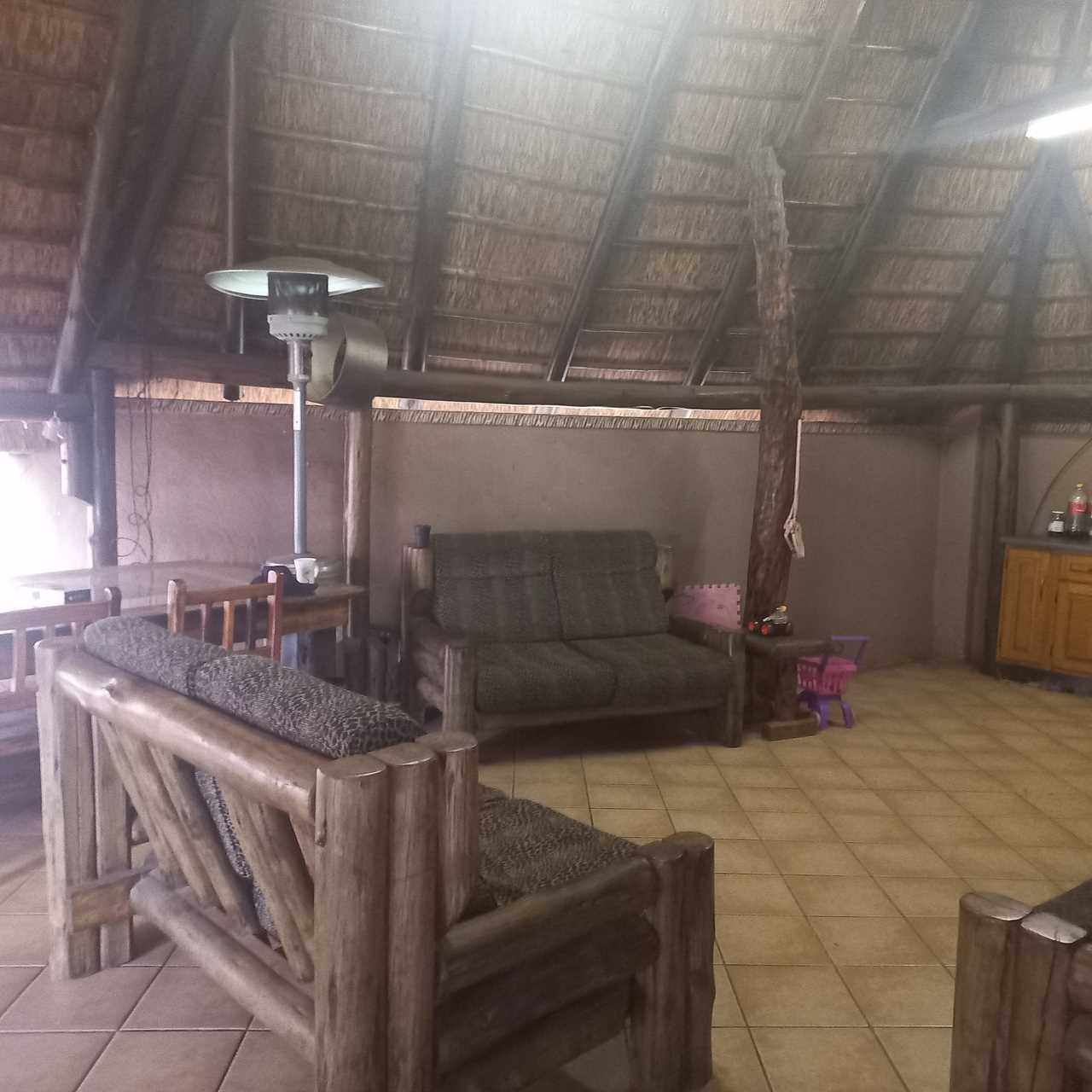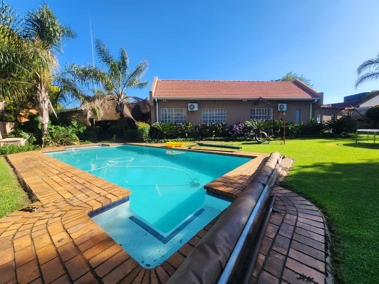cupboards of which there are plenty. This open plan living area leads onto a huge thatched lapa where you can entertain family and friends to your hearts comfortably.. There is also an outside toilet which allows easy access from the lapa. The three bedrooms are all a good size. The main en suite is fabulous with bath and shower. The guest bathroom is also modern with corner bath and double basin vanity. Outside you will find a separate laundry with domestic quarters adjoining, this set up lends itself to being able to convert to a small flatlet or outside room for a teenager pad. The house has dual water heaters and the outside room has its own gas water heater. There is also a pool leading out from the lapa area. This is a must on your viewing list.
