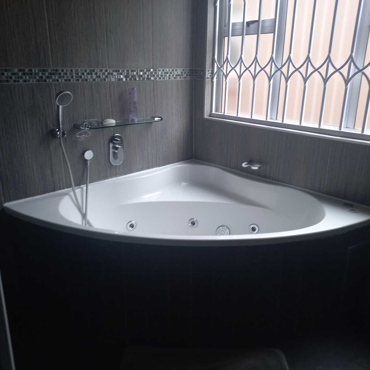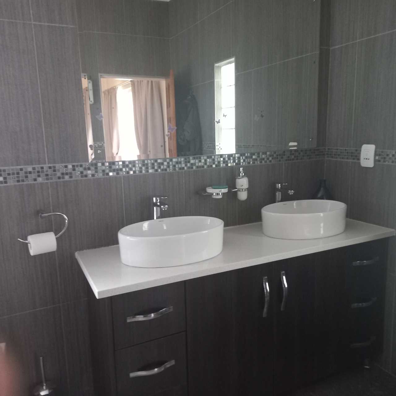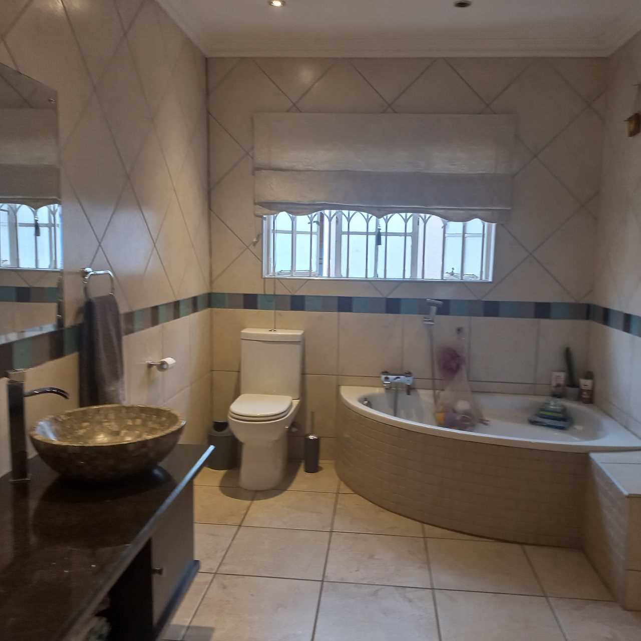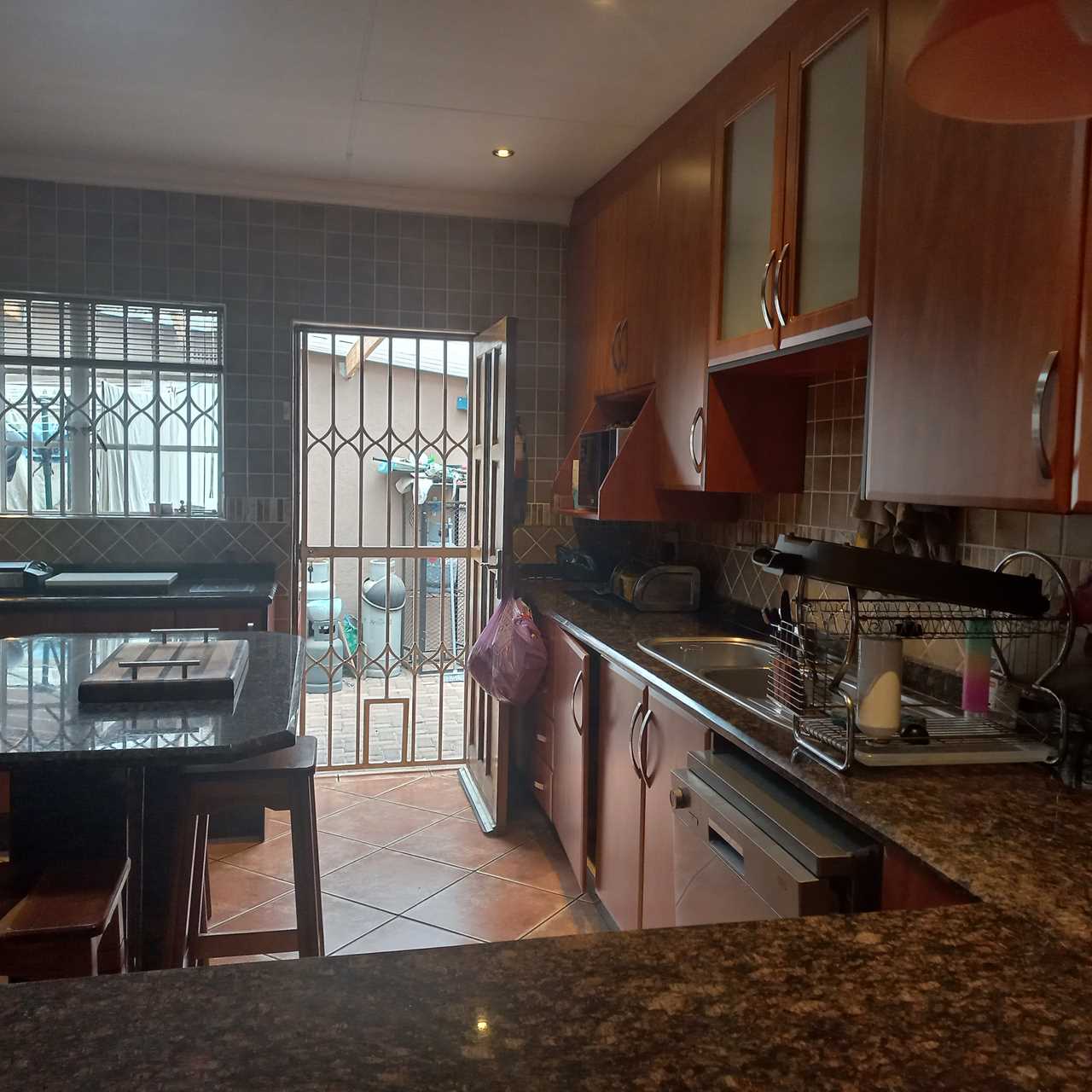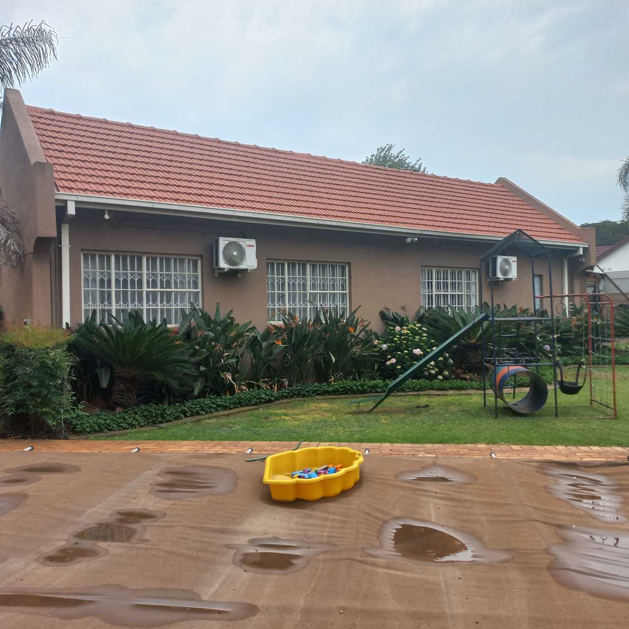 cupboards of which there are plenty. This open plan living area leads onto a huge thatched lapa where you can entertain family and friends to your hearts comfortably.. There is also an outside toilet which allows easy access from the lapa. The three bedrooms are all a good size. The main en suite is fabulous with bath and shower. The guest bathroom is also modern with corner bath and double basin vanity. Outside you will find a separate laundry with domestic quarters adjoining, this set up lends itself to being able to convert to a small flatlet or outside room for a teenager pad. The house has dual water heaters and the outside room has its own gas water heater. There is also a pool leading out from the lapa area. This is a must on your viewing list.