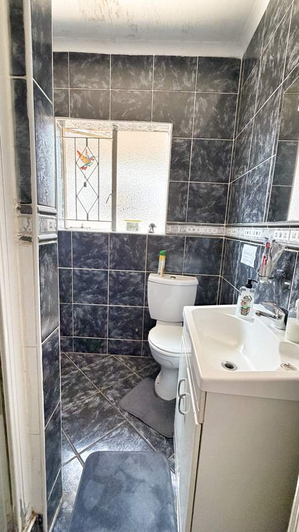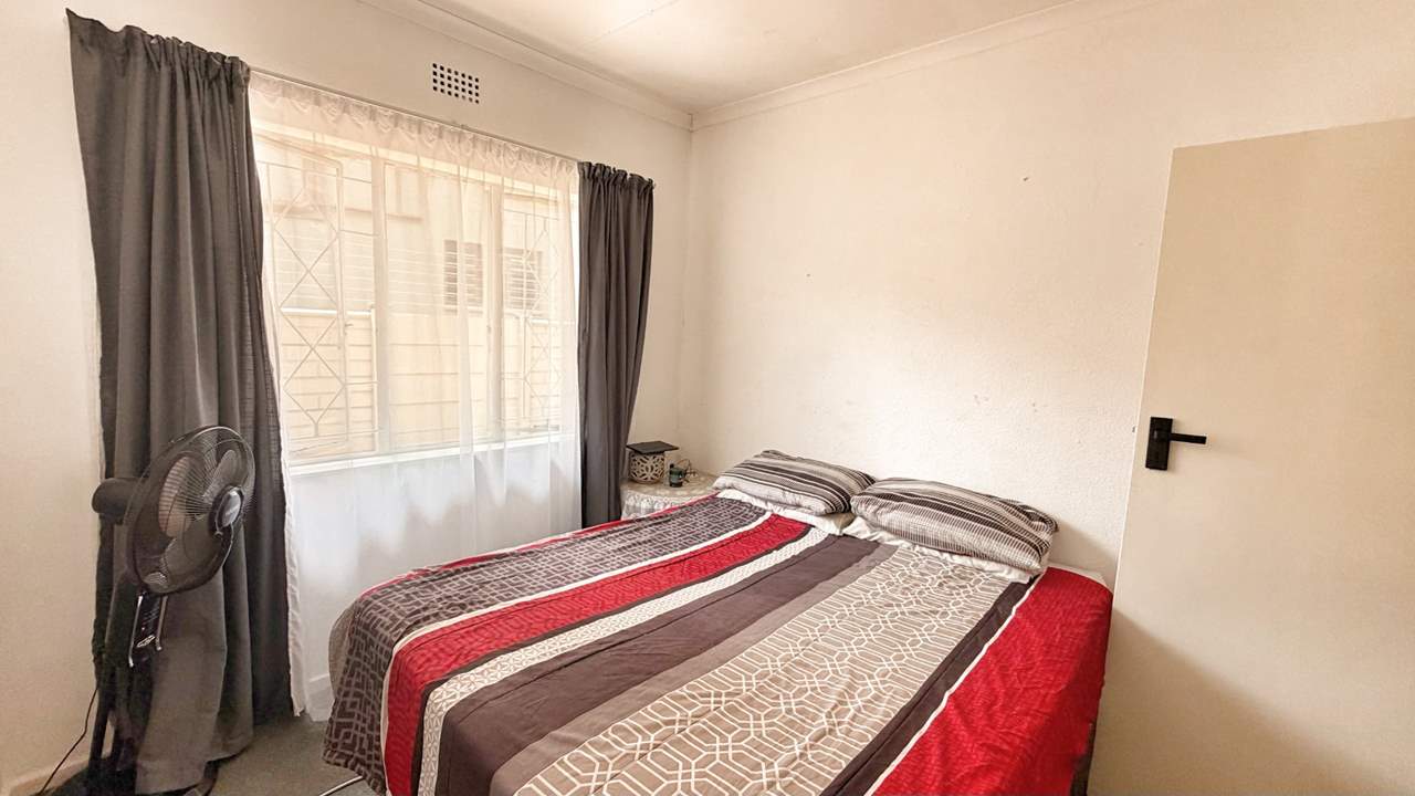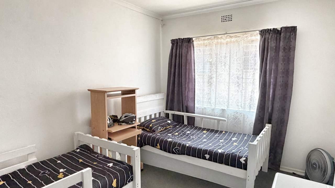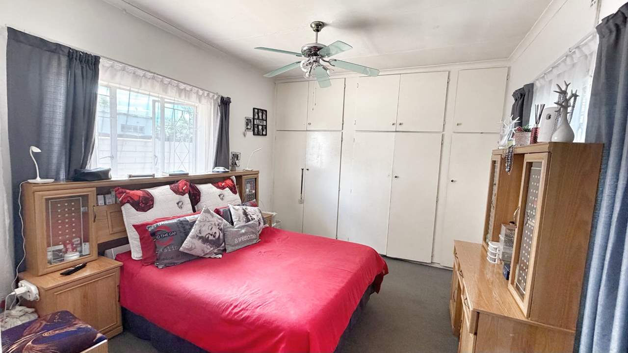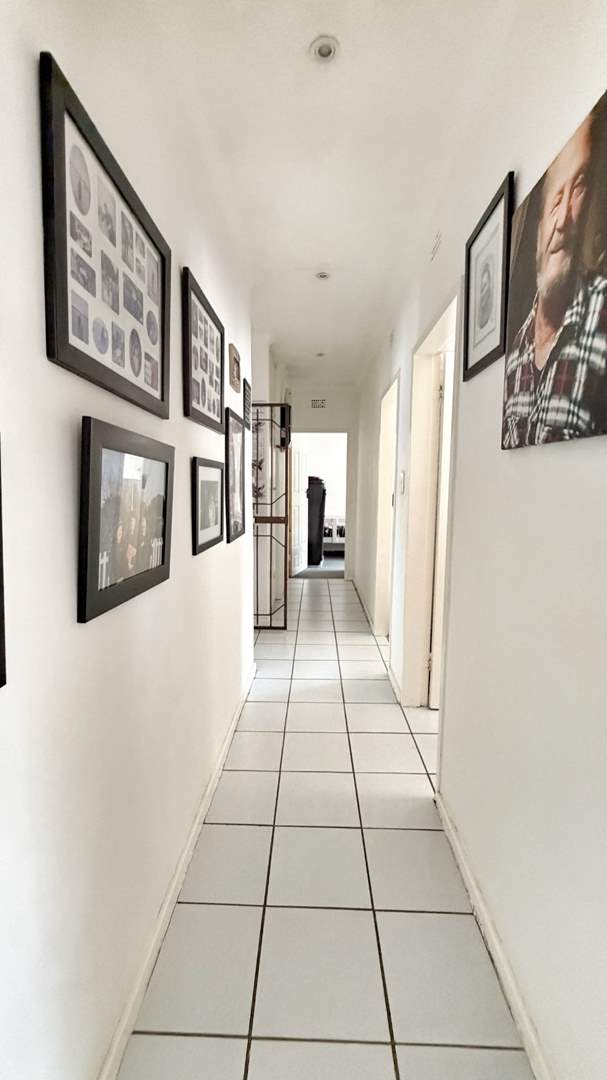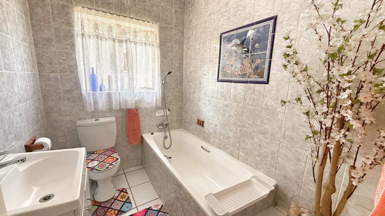 To the right of the entrance hall, the home offers three well-sized, carpeted bedrooms with built-in cupboards, as well as a convenient linen cupboard in the passage. The first two bedrooms share a neat bathroom complete with bath, basin, and toilet. The main bedroom features its own en-suite bathroom with shower, basin, and toilet, providing privacy and comfort.