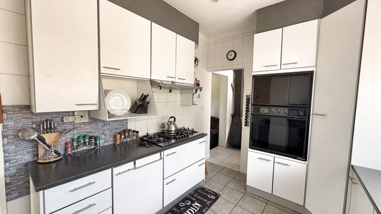 The functional kitchen is well-equipped with ample cupboard space, a 5-burner gas hob, eye-level oven, and space for a washing machine — making daily living both practical and enjoyable.