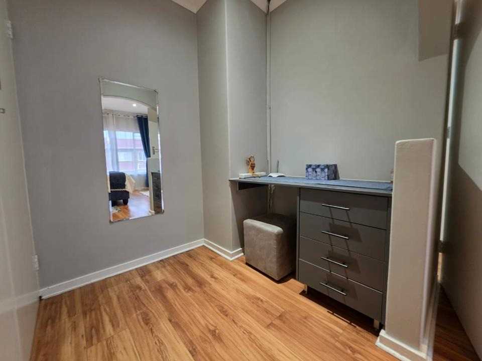 Upon entering, you'll discover two generously sized bedrooms. The main bedroom is a standout feature, boasting a dedicated dressing room—a luxurious touch that’s hard to find. The home is served by a full modern bathroom, complete with sleek finishes that add a touch of sophistication.