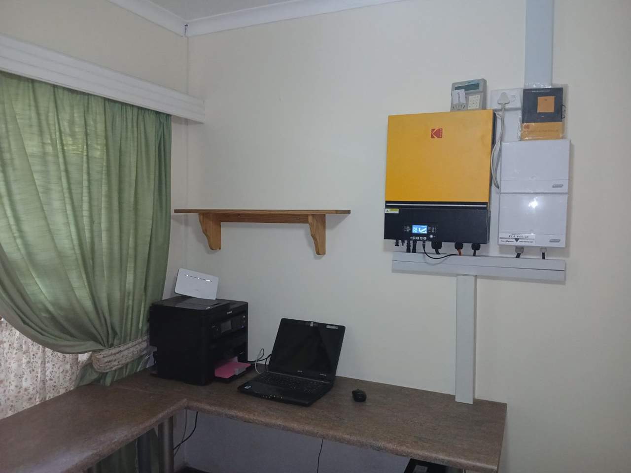 6 solar panels, 5 batteries, and a 7.2kW inverter providing backup power for everything except the geyser.