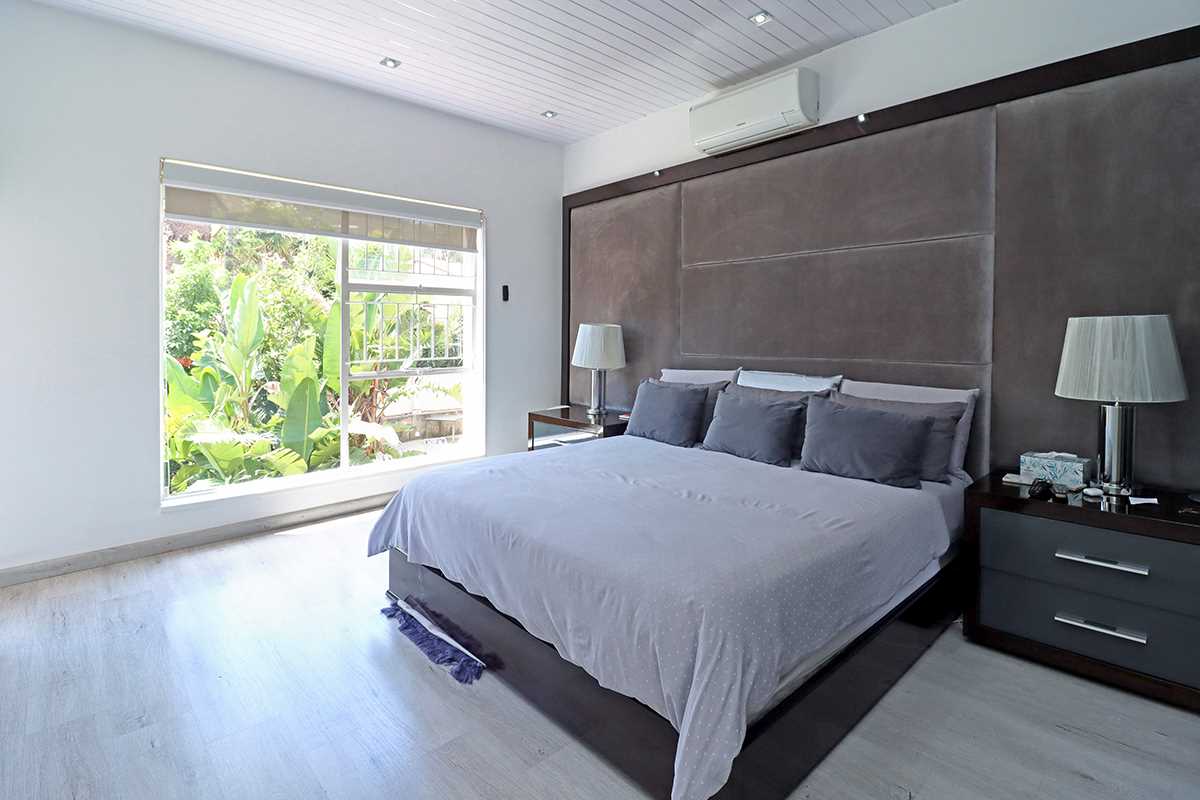 The main bedroom is a true retreat, finished with a fitted headboard and a calm, sophisticated aesthetic. Laminate flooring throughout the bedrooms adds warmth and refinement.