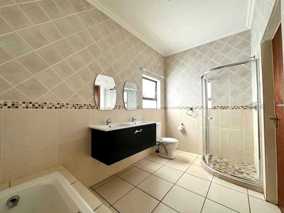 The main bedroom features an en-suite bathroom, while the remaining two bedrooms share a second full bathroom — all equipped with built-in cupboards for easy storage.