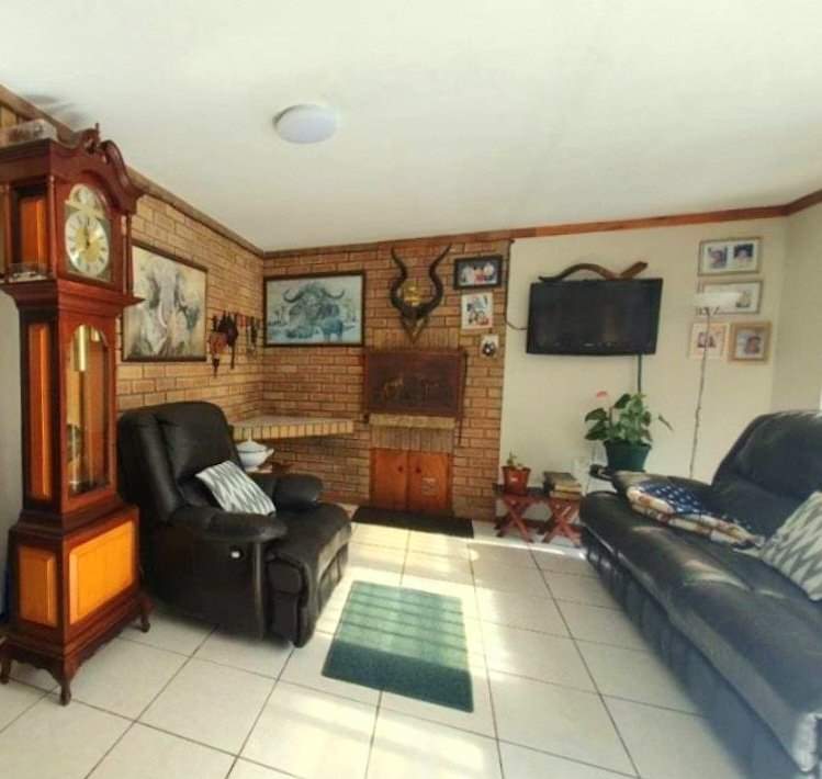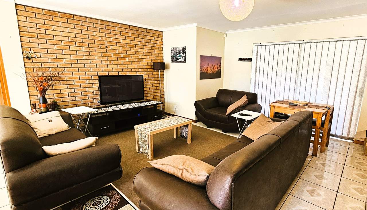 Entertainment Haven: The central hub on the ground level features a cozy TV room seamlessly connected to a covered patio, overlooking a grassy, leafy garden—ideal for socializing and hosting memorable braais.