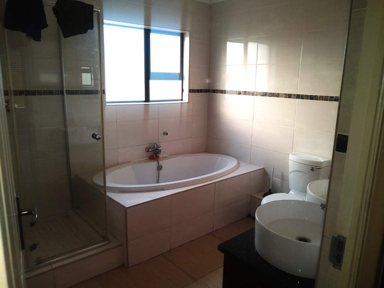 Main bathroom in downstairs with shower toilet, and basin, modern kitchen, open plan lounge dinning room, double electric door garage, braai place.