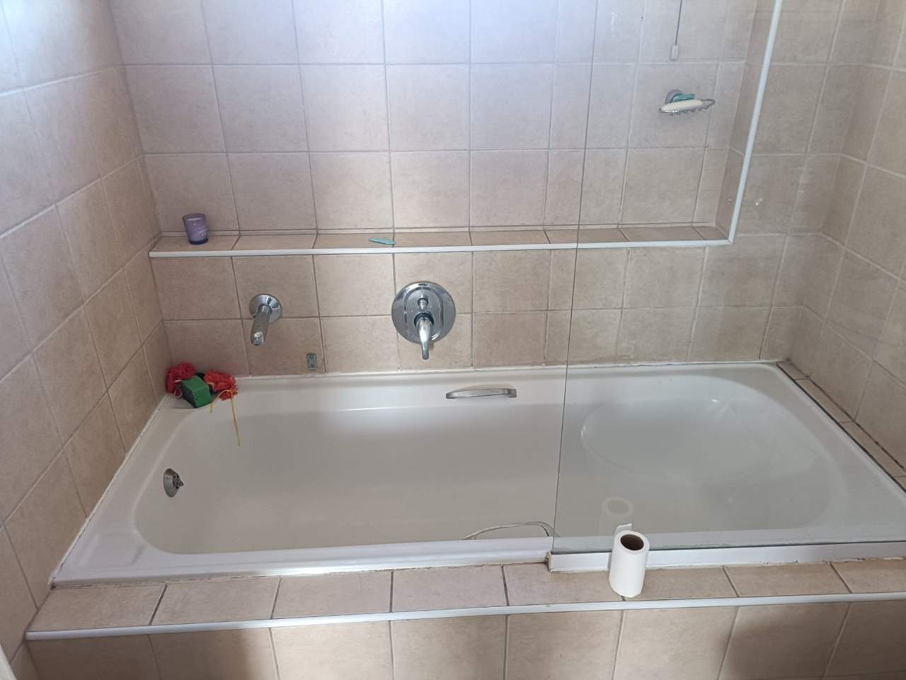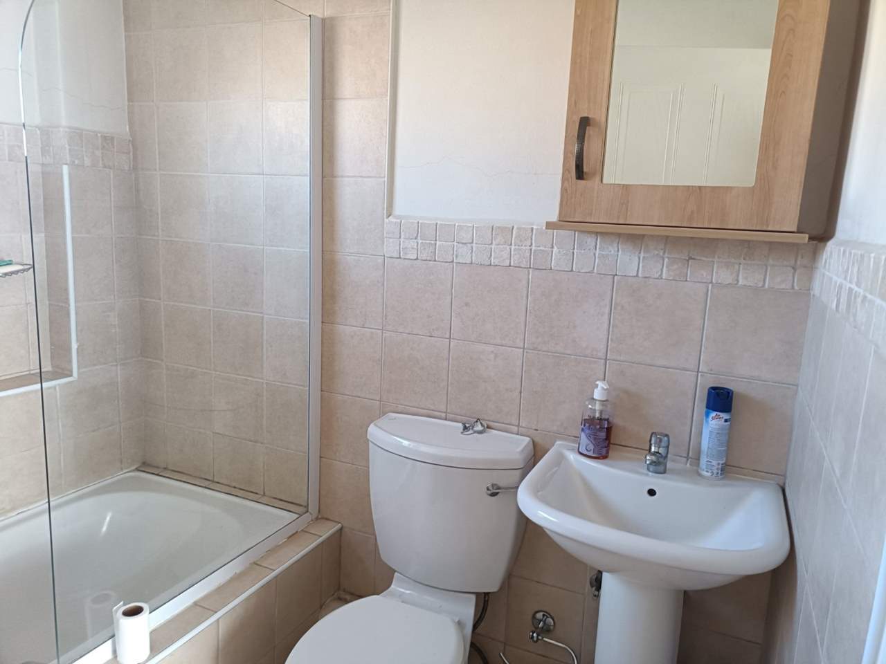 Full Family Bathroom:?A neat, tiled bathroom featuring a versatile bath-shower combination with a glass splash screen.