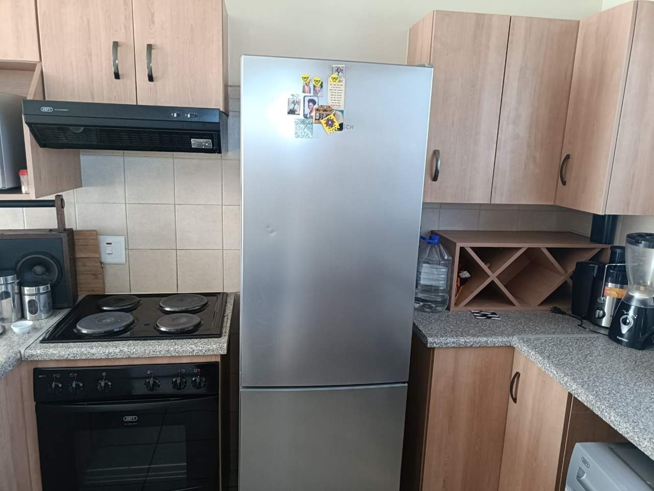 Modern Kitchen:?A functional workspace featuring sleek granite-style countertops, ample cabinetry, and a convenient breakfast bar. The kitchen is equipped with a built-in hob and oven and has designated space for a fridge and washing machine.