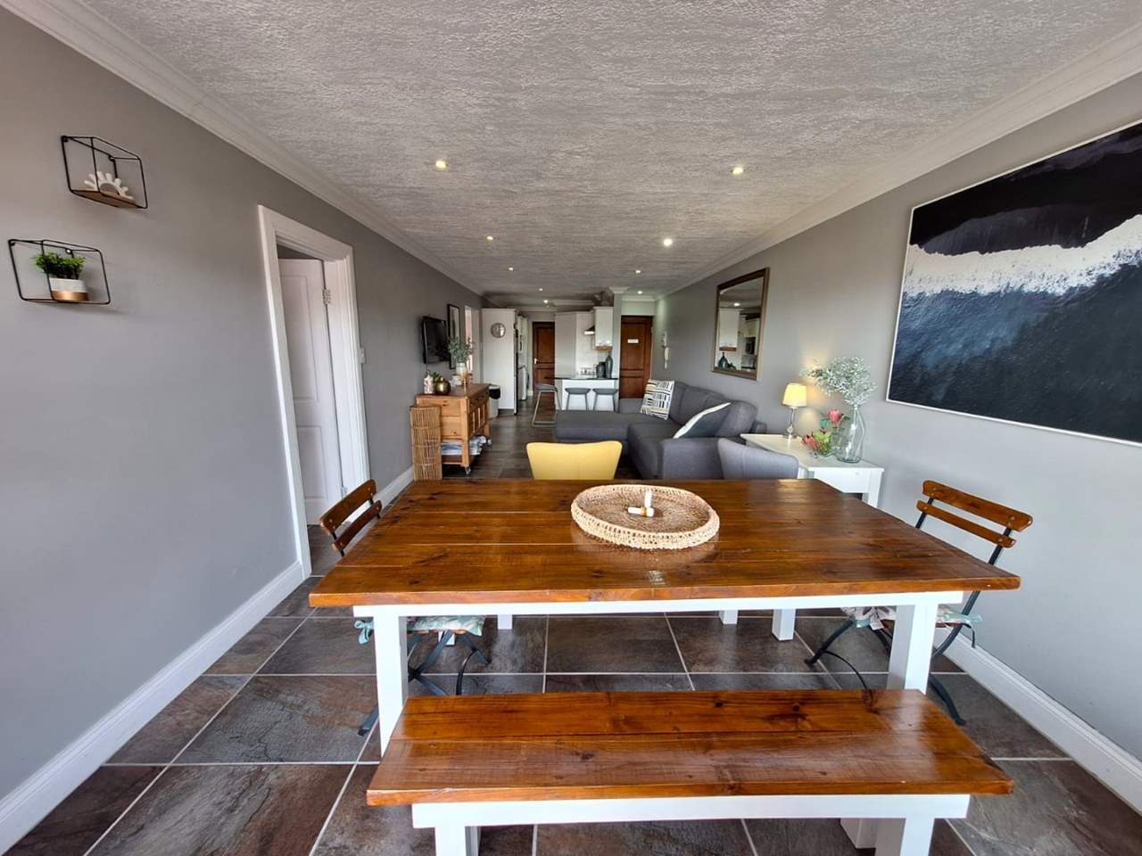 Step inside and you’re greeted by a bright, open-plan living area that flows from lounge to dining space and out onto a covered balcony. Here, a built-in braai and sweeping sea views set the scene for laid-back entertaining after a day at the beach.