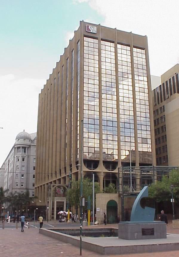 Sage Centre is a landmark B-grade office building located at 24 Pritchard Street, Johannesburg CBD. The building features a concrete frame, extensive window walling, and textured concrete columns under a flat roof. It includes basement parking, a ground floor reception, and retail spaces, with 12 office floors above.