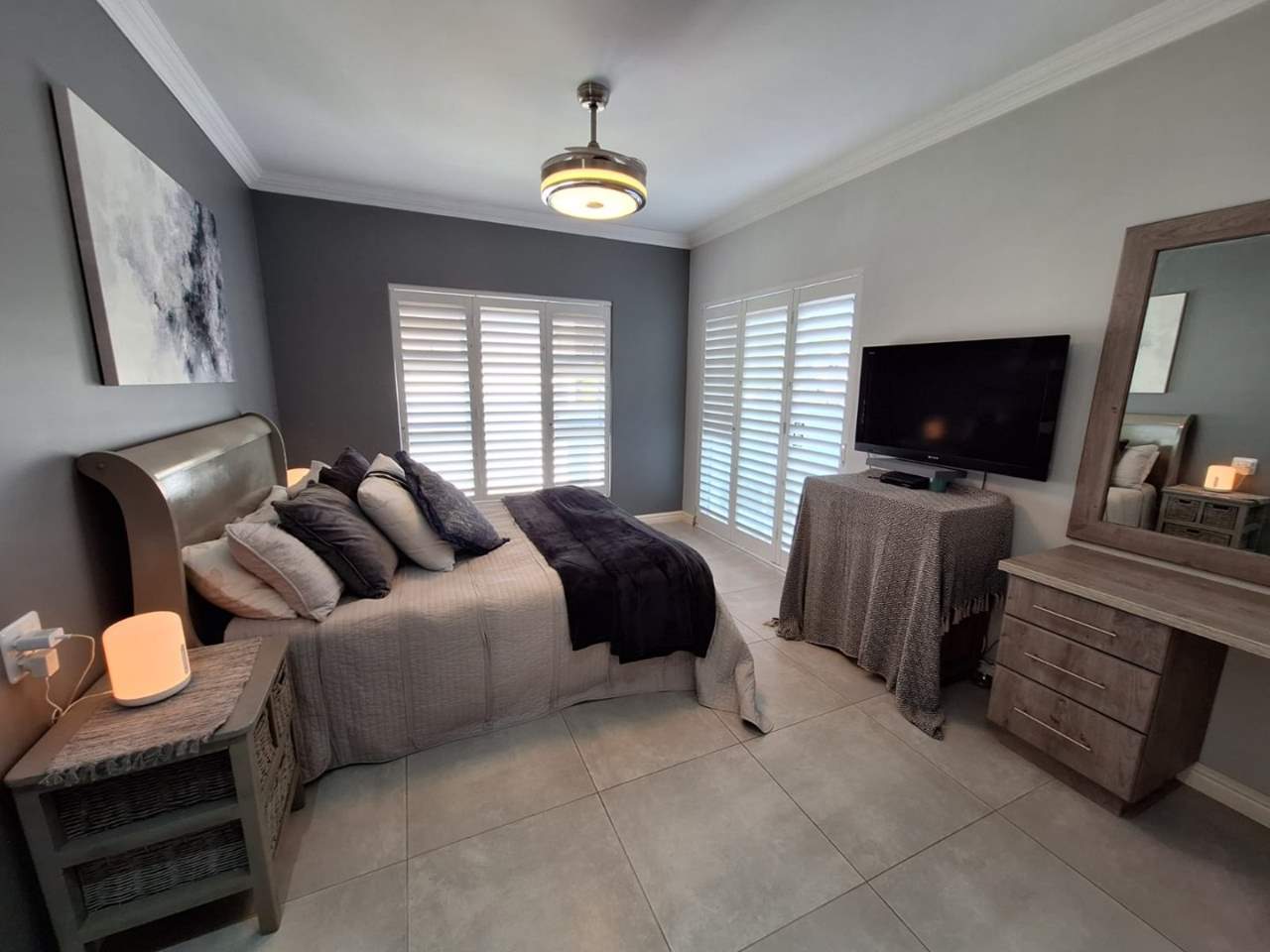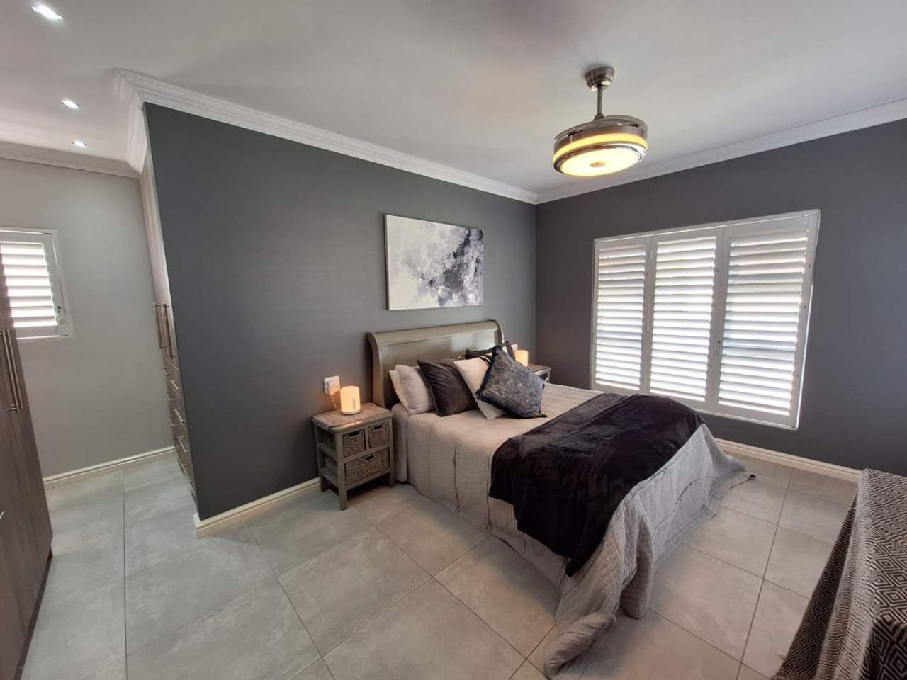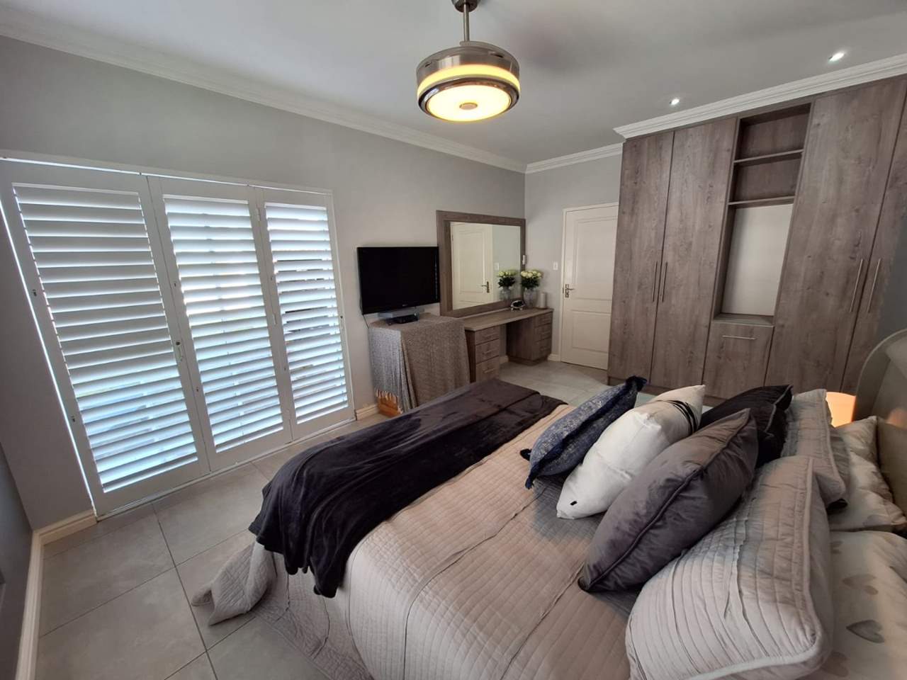 The bedroom wing of the home ensures privacy and comfort. The master suite is generously sized, with space for a king bed, ample cupboards, and a modern en-suite bathroom fitted with a double vanity, large shower, and toilet. This suite enjoys direct garden access, while stylish American shutters provide both sophistication and security. The two additional bedrooms are light-filled, fitted with built-in cupboards, and serviced by a full family bathroom that also functions as a guest facility when entertaining.