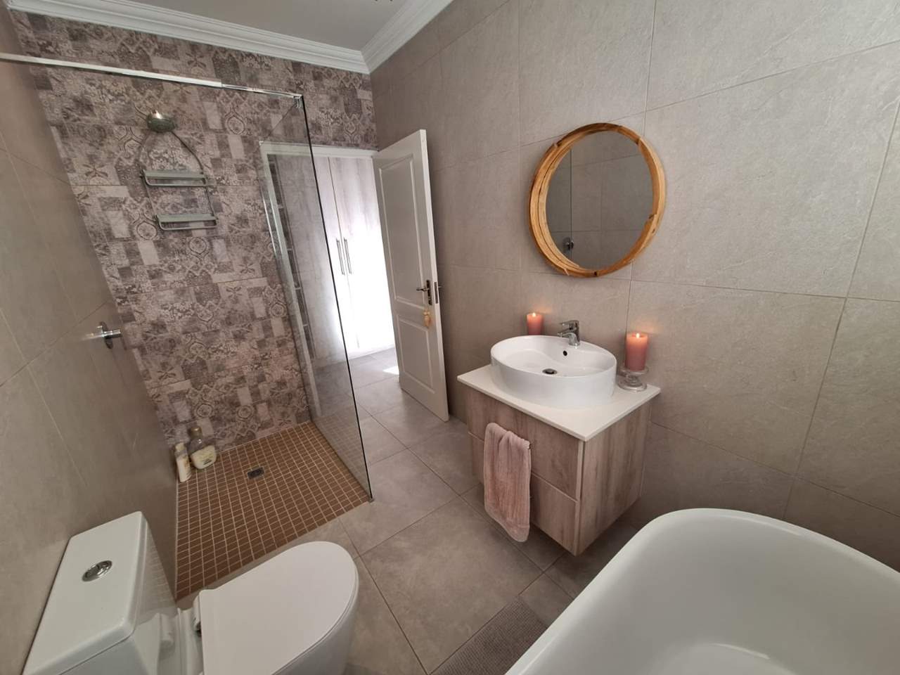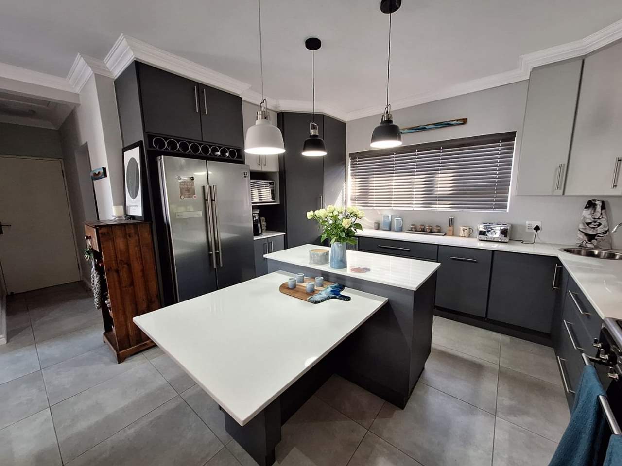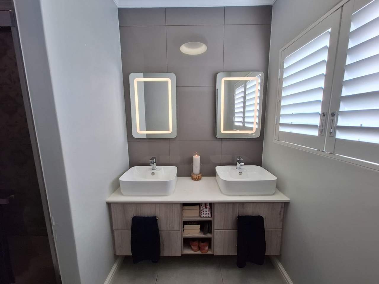 The bedroom wing of the home ensures privacy and comfort. The master suite is generously sized, with space for a king bed, ample cupboards, and a modern en-suite bathroom fitted with a double vanity, large shower, and toilet. This suite enjoys direct garden access, while stylish American shutters provide both sophistication and security. The two additional bedrooms are light-filled, fitted with built-in cupboards, and serviced by a full family bathroom that also functions as a guest facility when entertaining.