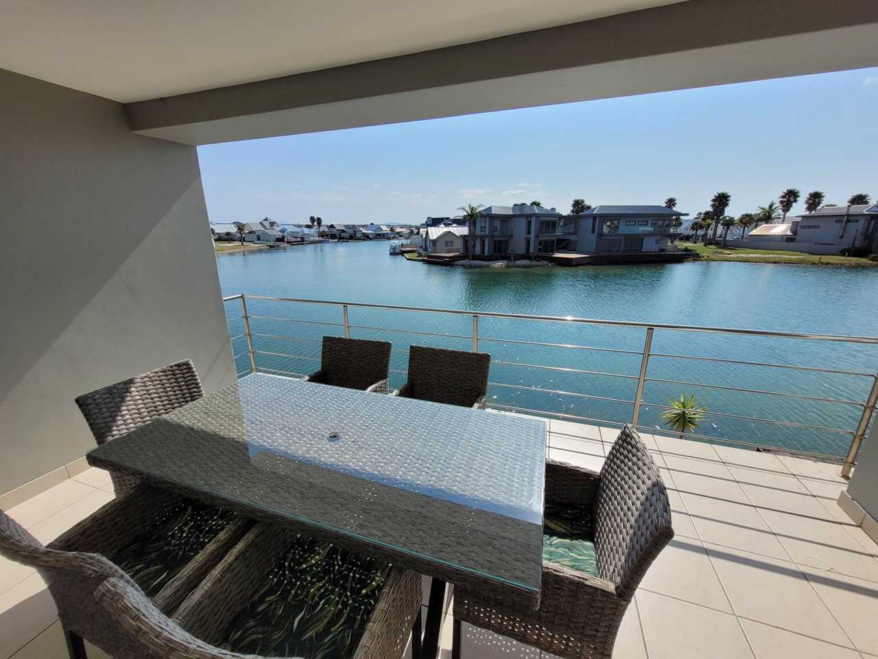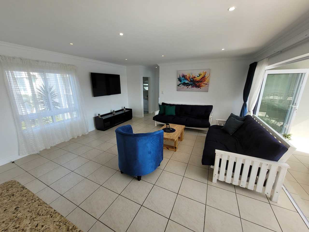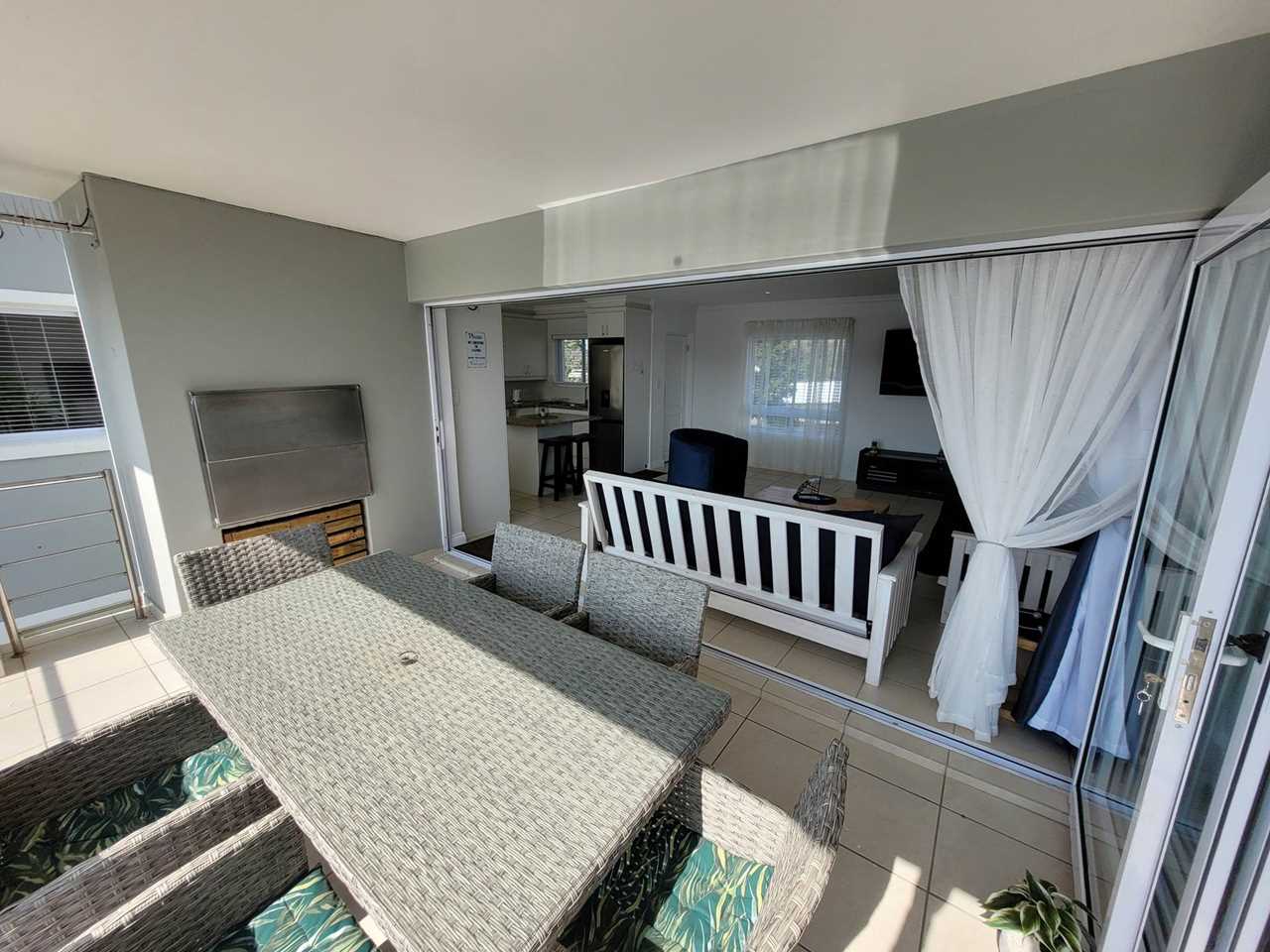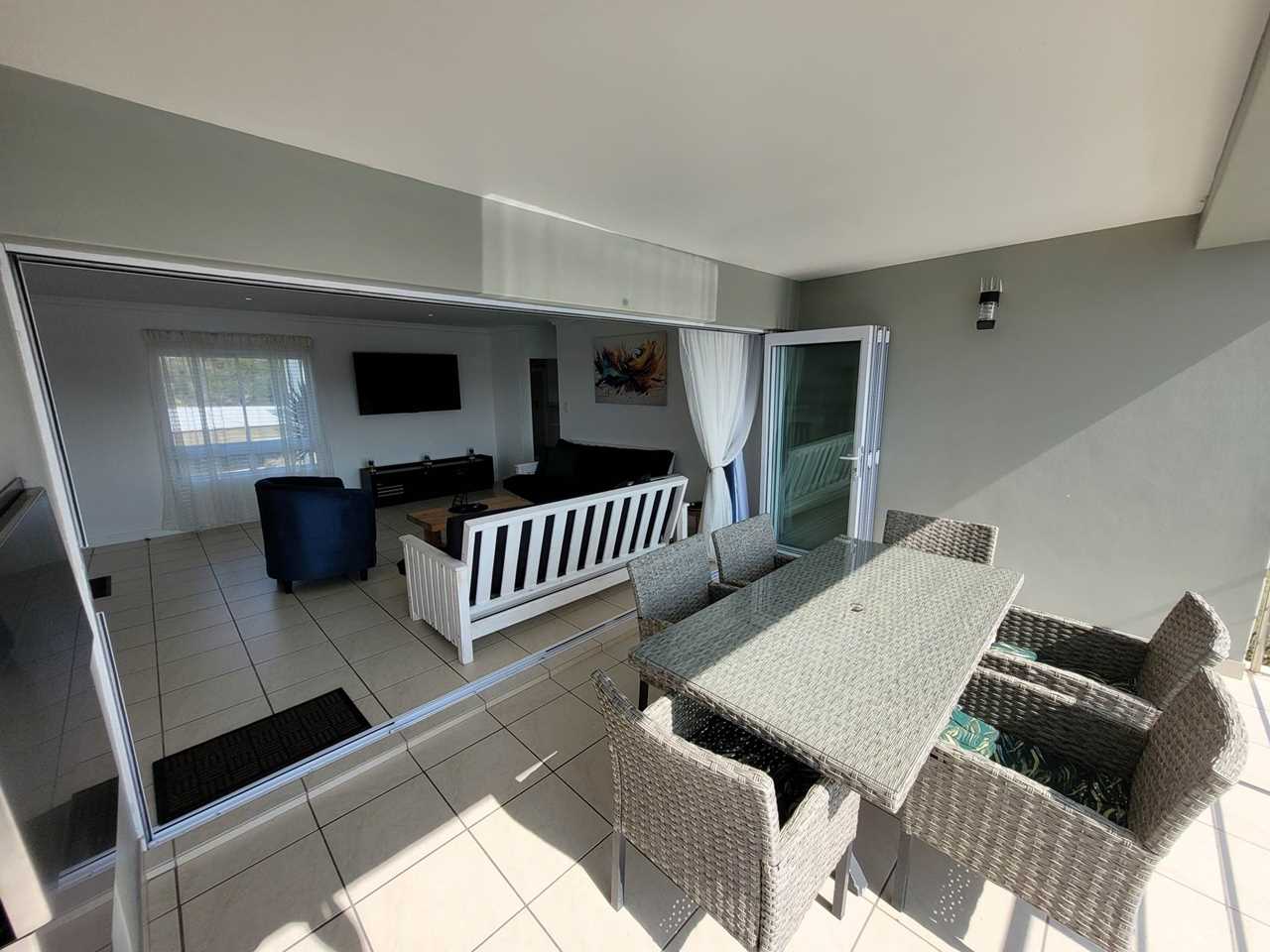 The apartment features a generous open-plan living area that flows effortlessly onto a large, covered patio via stackable sliding doors – ideal for entertaining or relaxing while soaking up the tranquil surroundings. The patio includes a brand-new built-in stainless steel braai for ultimate outdoor living.