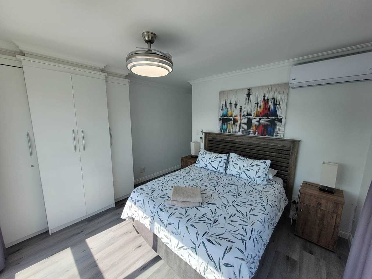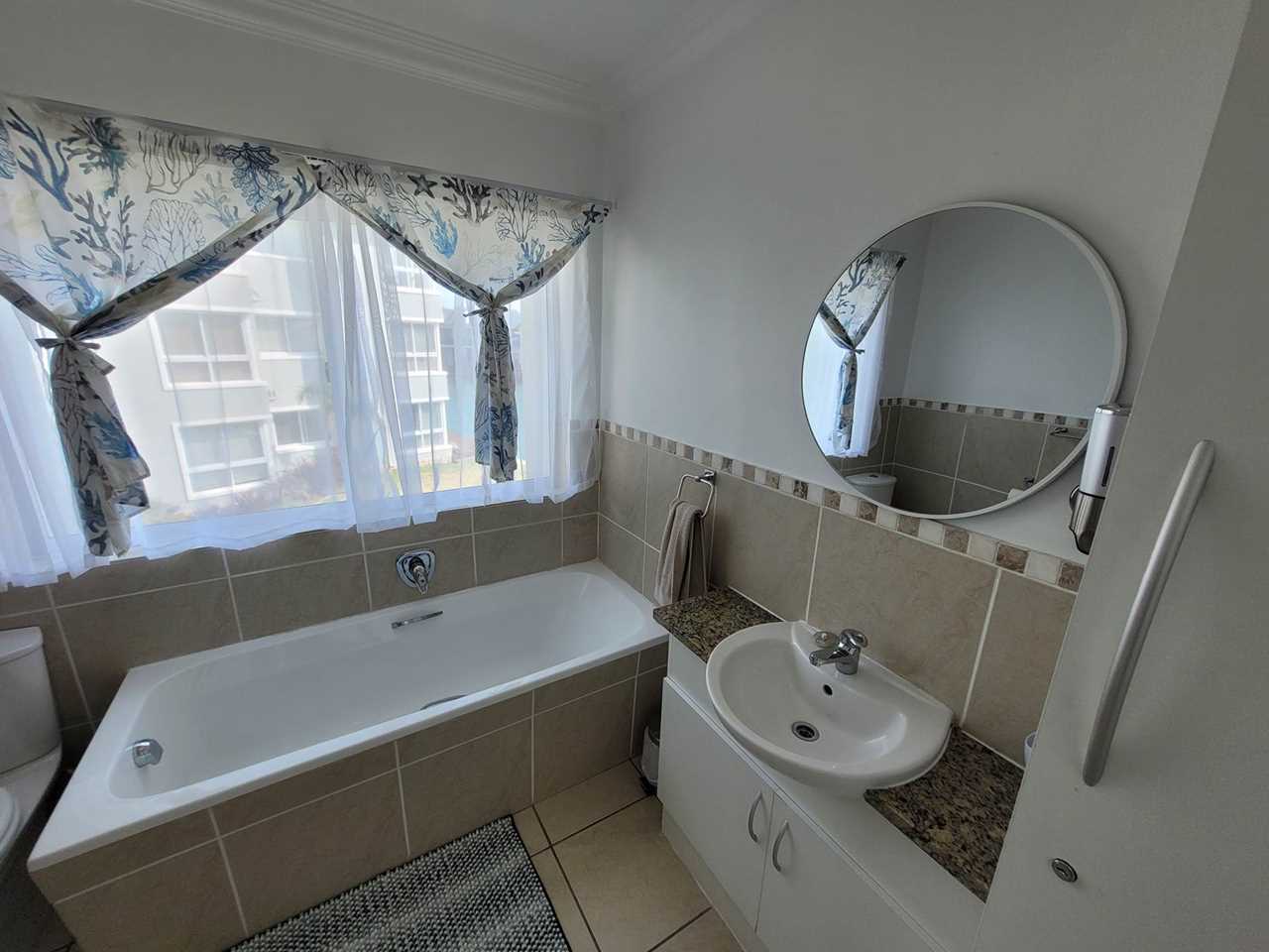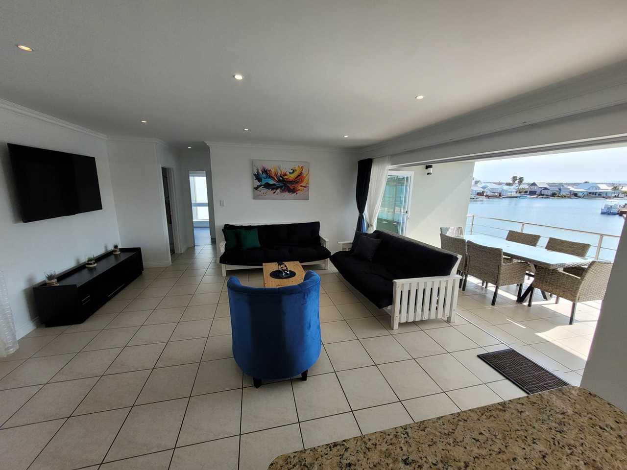The apartment features a generous open-plan living area that flows effortlessly onto a large, covered patio via stackable sliding doors – ideal for entertaining or relaxing while soaking up the tranquil surroundings. The patio includes a brand-new built-in stainless steel braai for ultimate outdoor living.