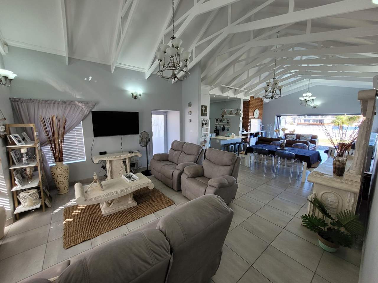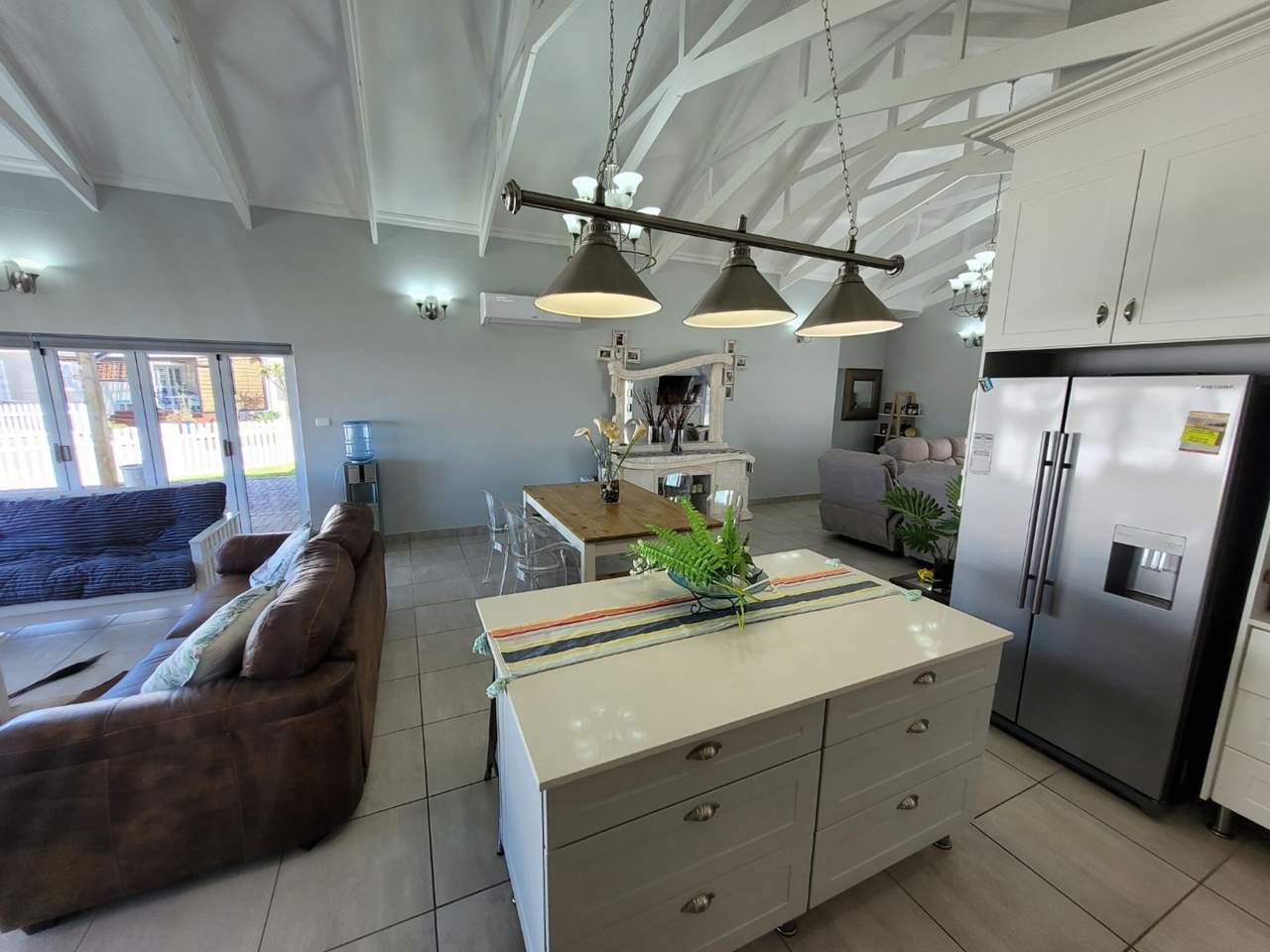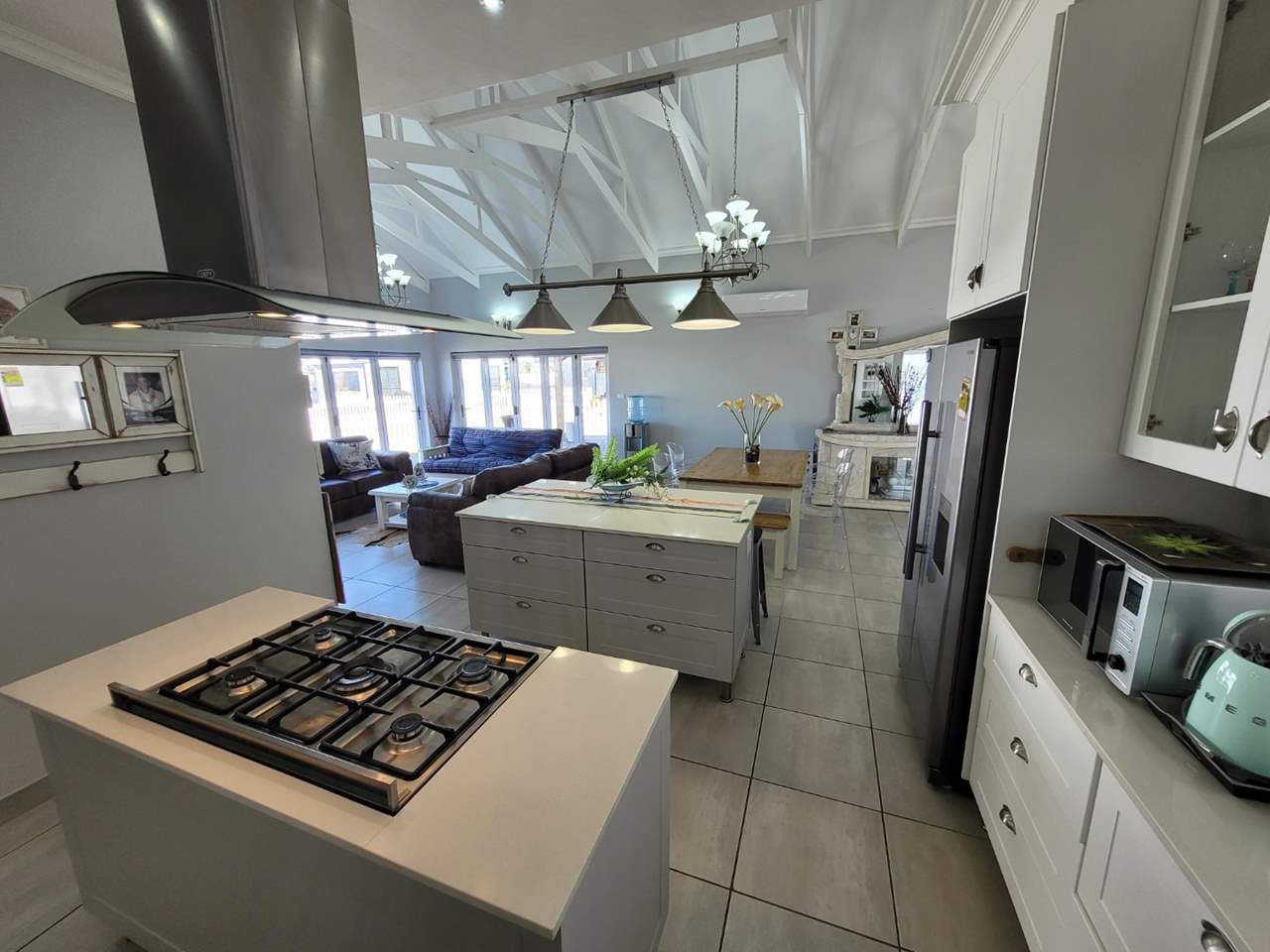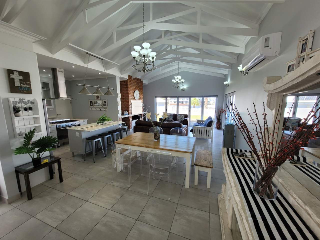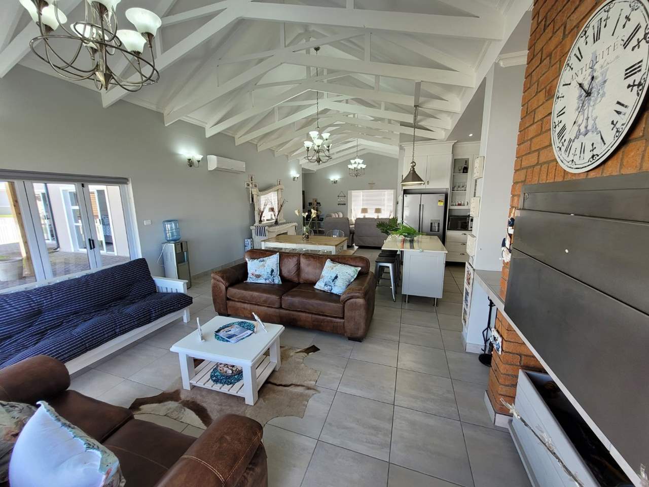 Inside, the home boasts a spacious open-plan design with high, exposed truss ceilings that enhance the sense of light and space. The open living area includes a TV lounge, dining room, and an entertainment area with a built-in stainless steel braai and two sets of stacking doors — seamlessly connecting indoor and outdoor living spaces.