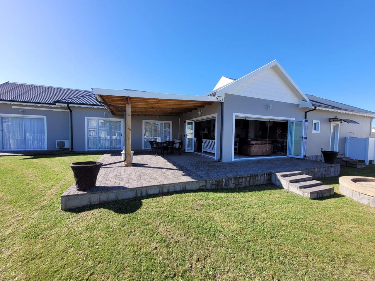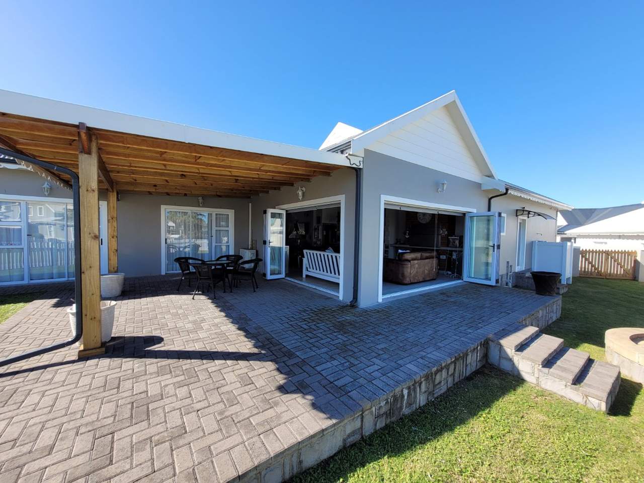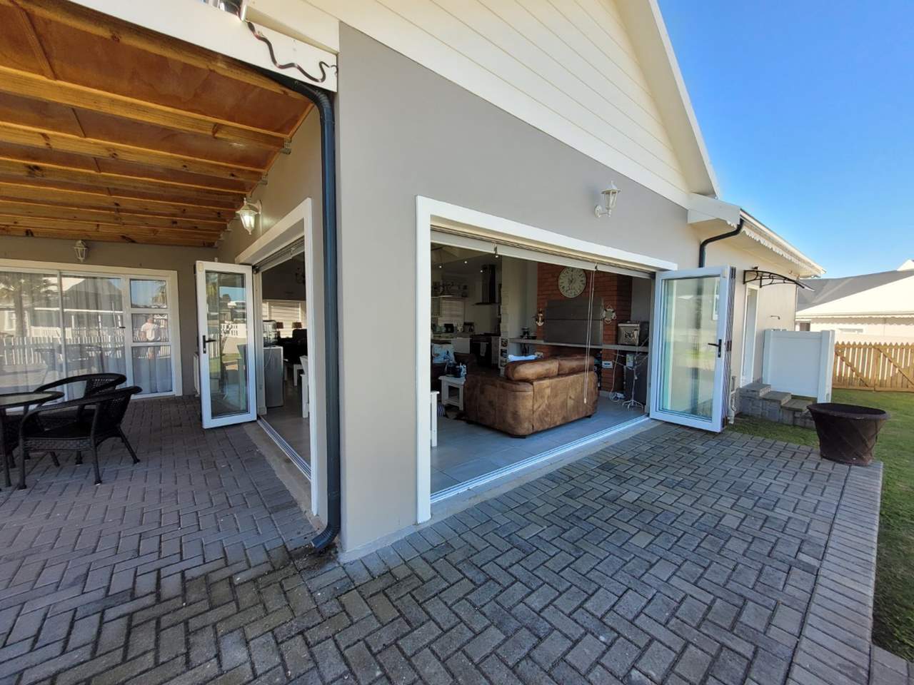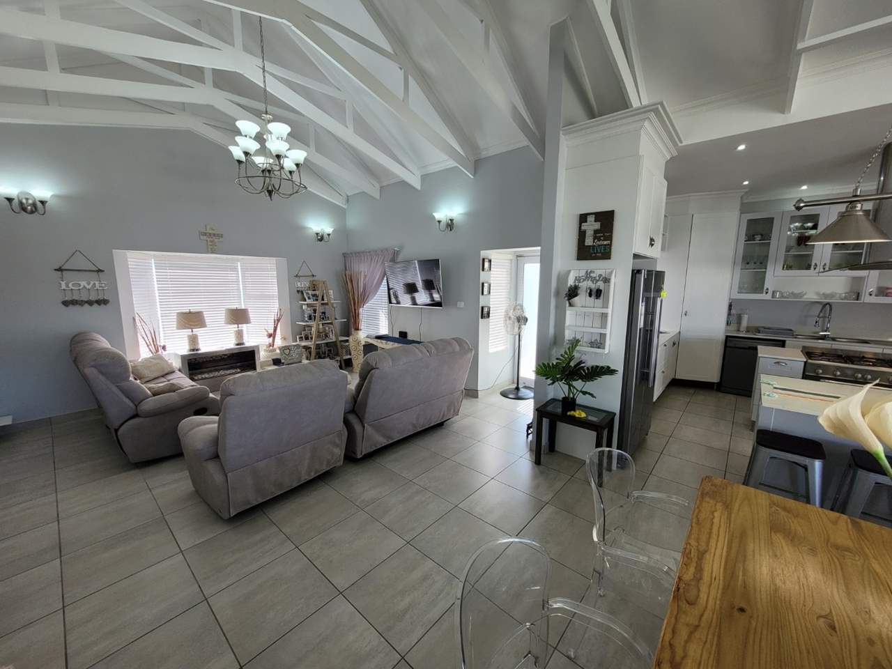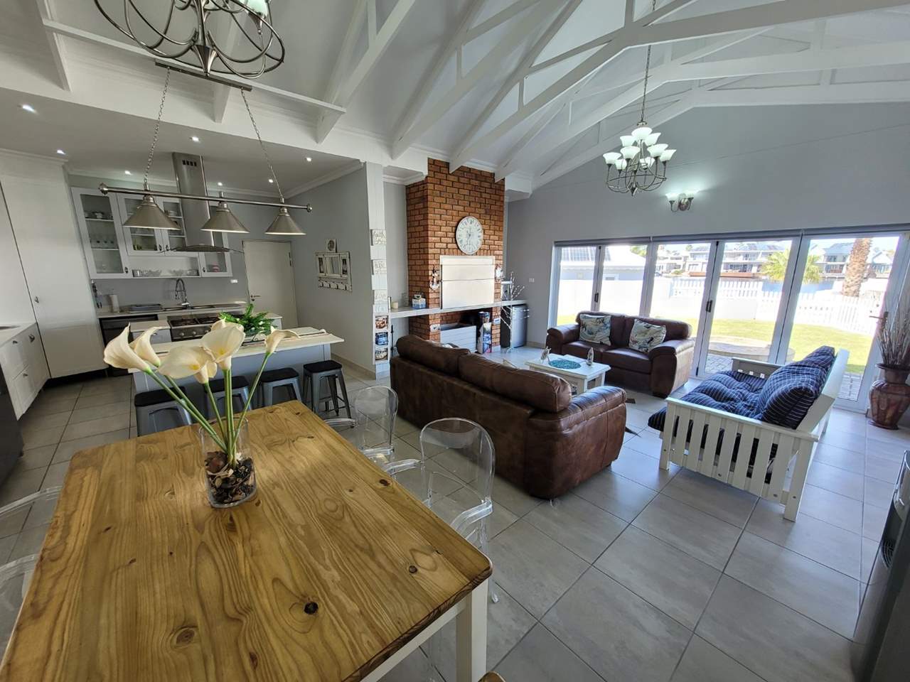 Inside, the home boasts a spacious open-plan design with high, exposed truss ceilings that enhance the sense of light and space. The open living area includes a TV lounge, dining room, and an entertainment area with a built-in stainless steel braai and two sets of stacking doors — seamlessly connecting indoor and outdoor living spaces.