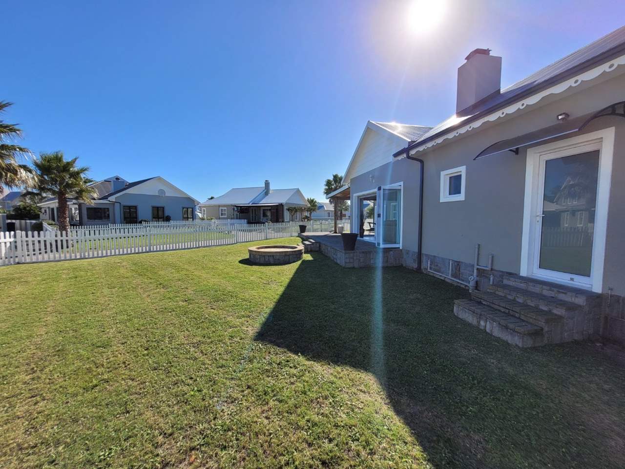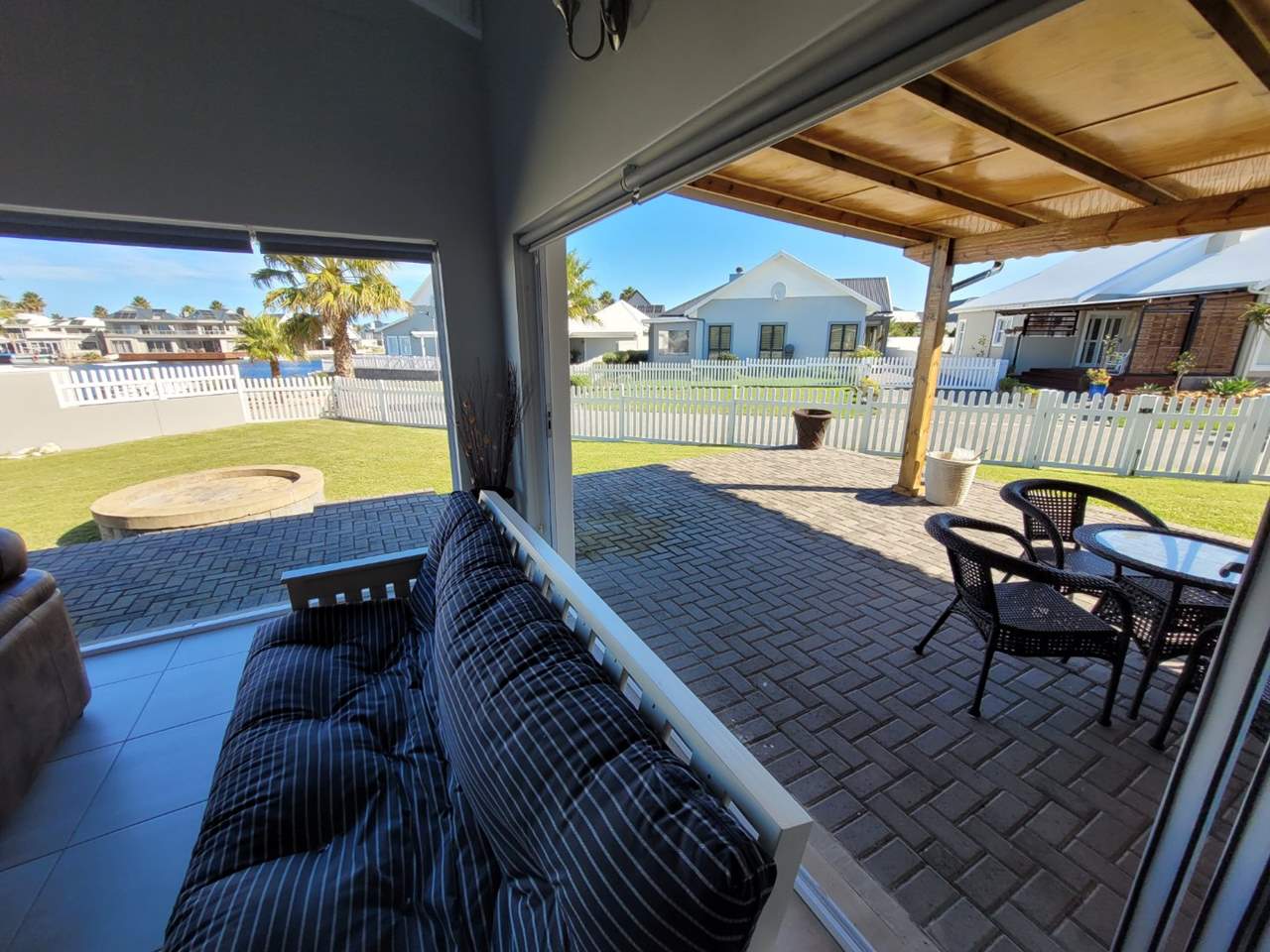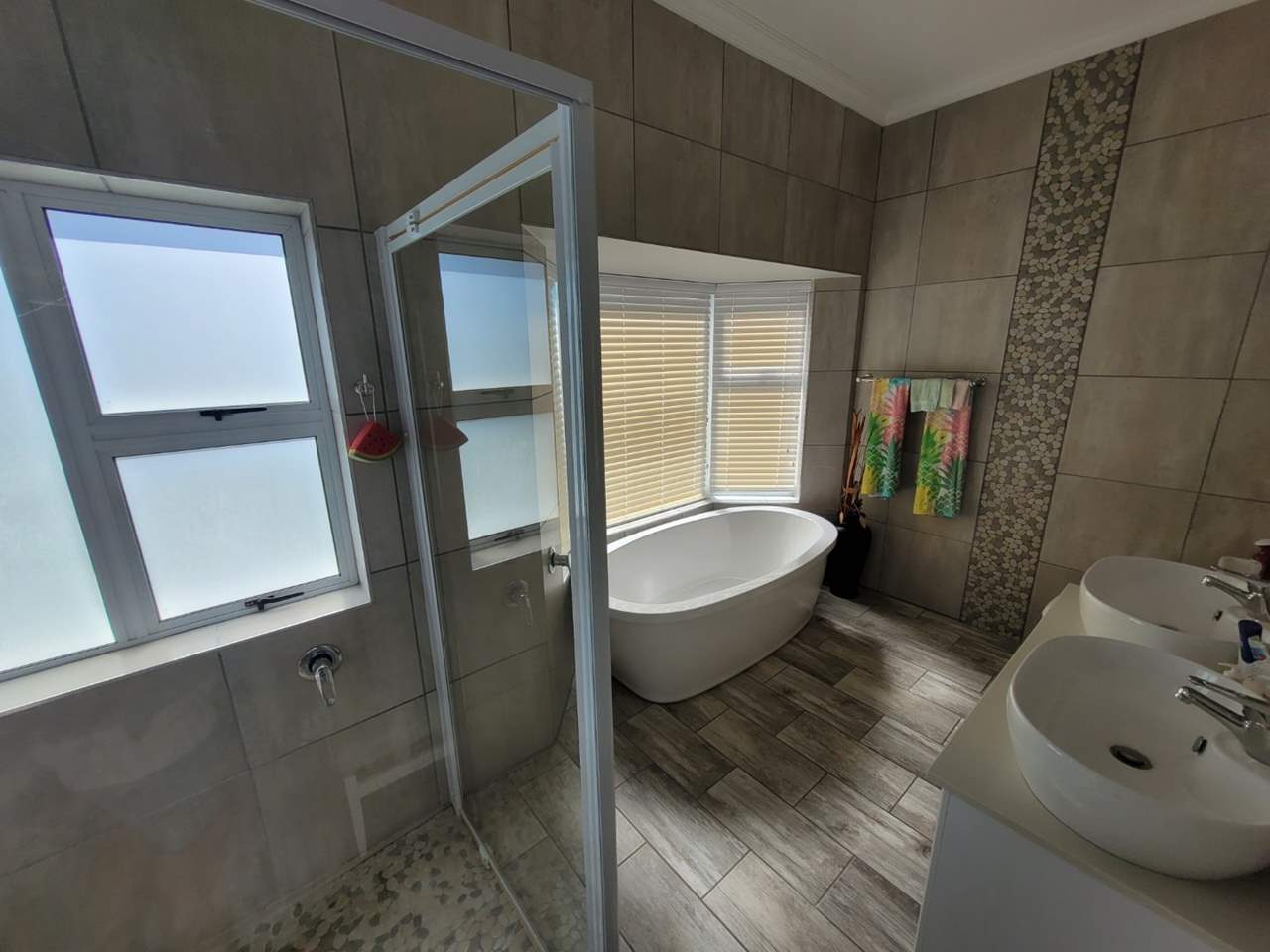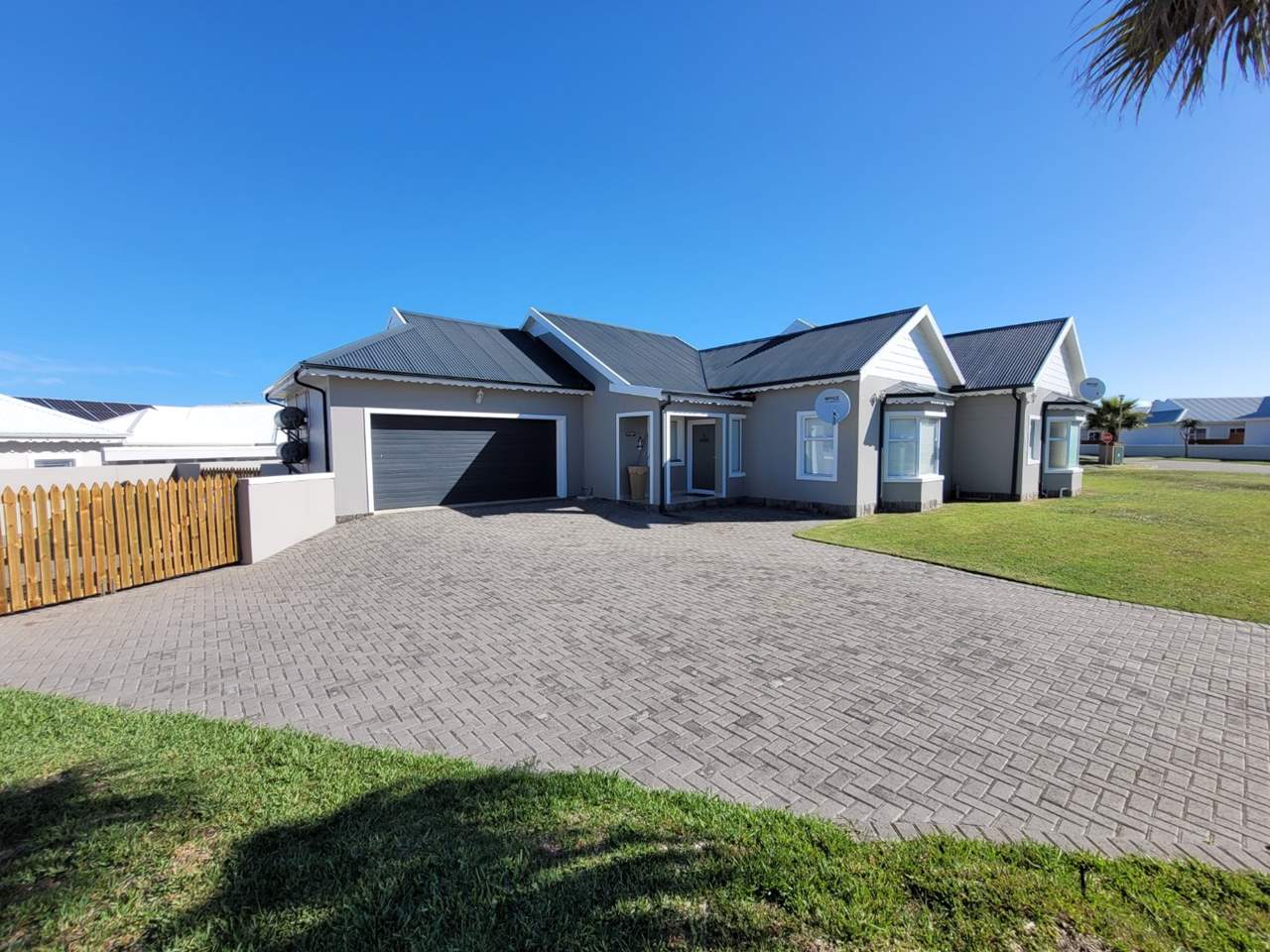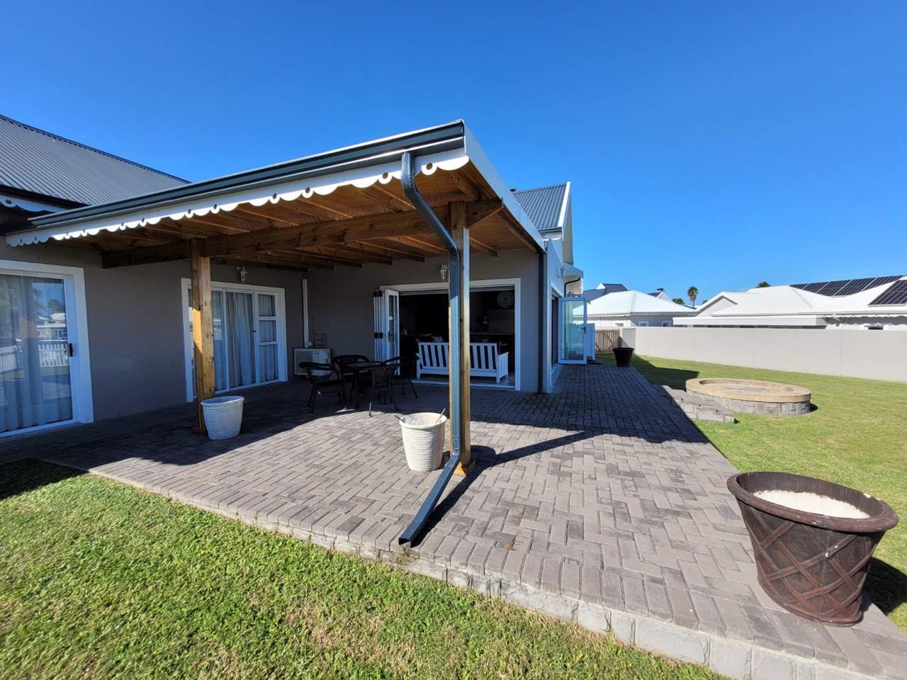 Inside, the home boasts a spacious open-plan design with high, exposed truss ceilings that enhance the sense of light and space. The open living area includes a TV lounge, dining room, and an entertainment area with a built-in stainless steel braai and two sets of stacking doors — seamlessly connecting indoor and outdoor living spaces.