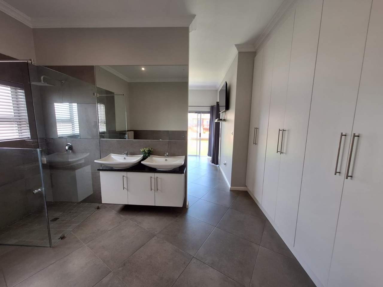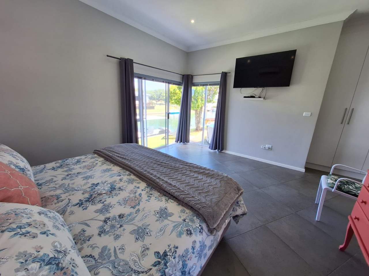 The open-plan living area combines the lounge, dining, and kitchen spaces in a seamless flow, leading out to a covered patio with a built-in braai and a beautiful open-air paved patio. Here, you’ll experience the best of outdoor entertaining while soaking up the serene canal views.