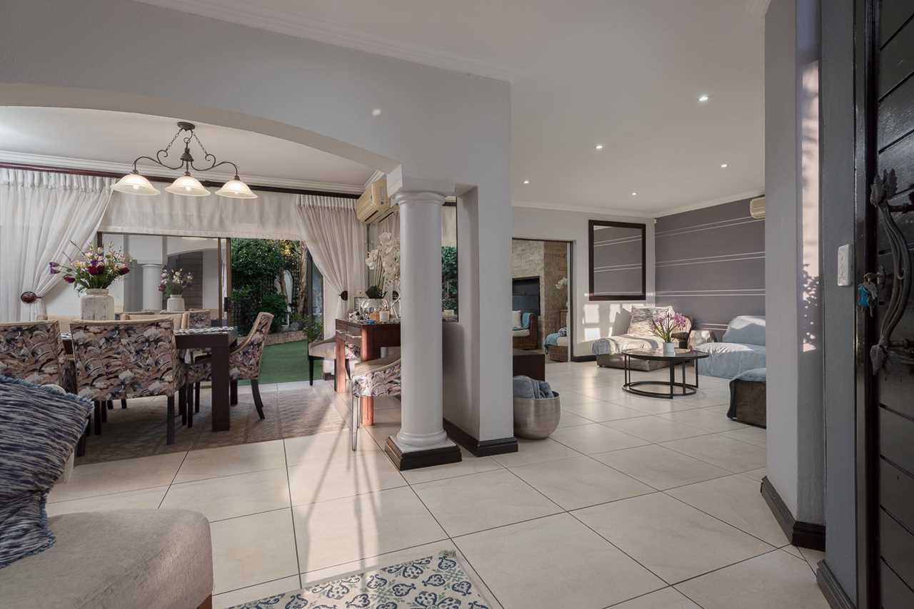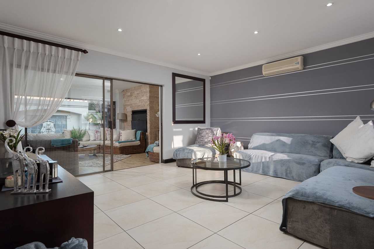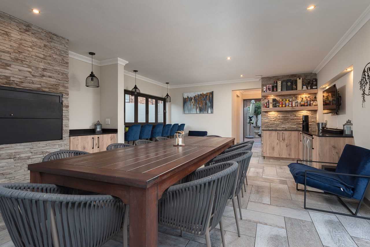 Double-volume entrance hall, elegant dining room with aircon, Large TV lounge with wallpaper feature, and an amazing enclosed sunroom/entertainment patio with built-in braai and stack doors opening to the pool.