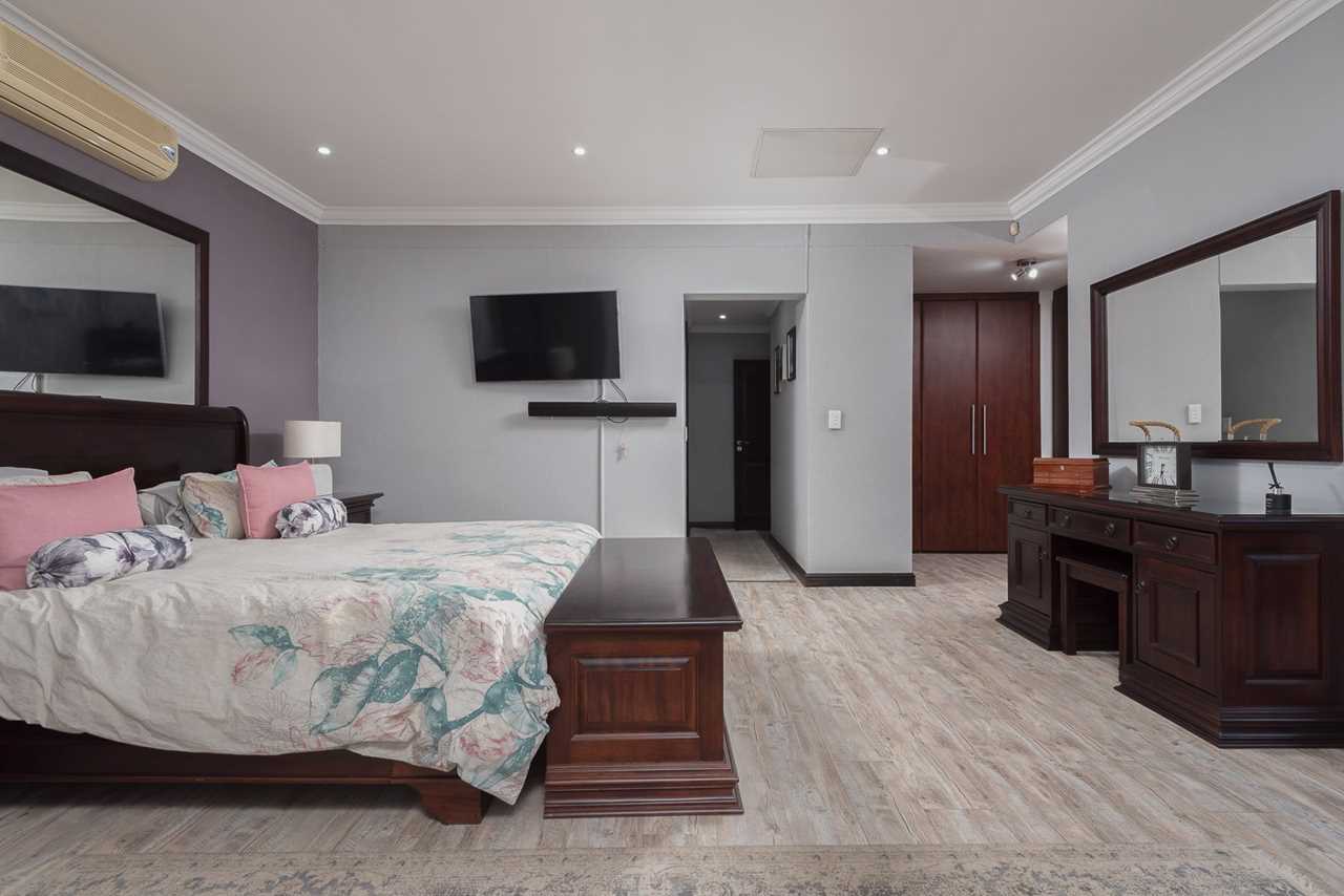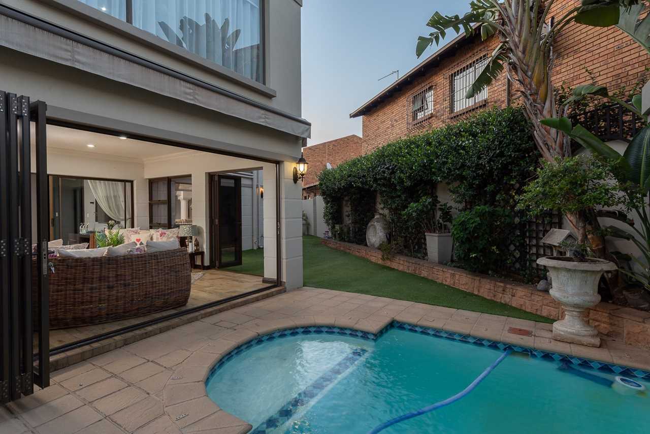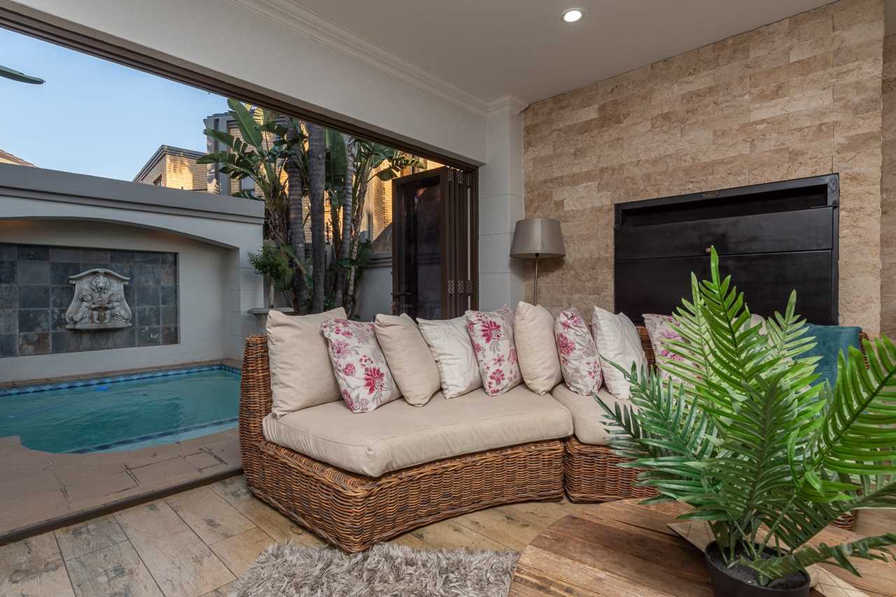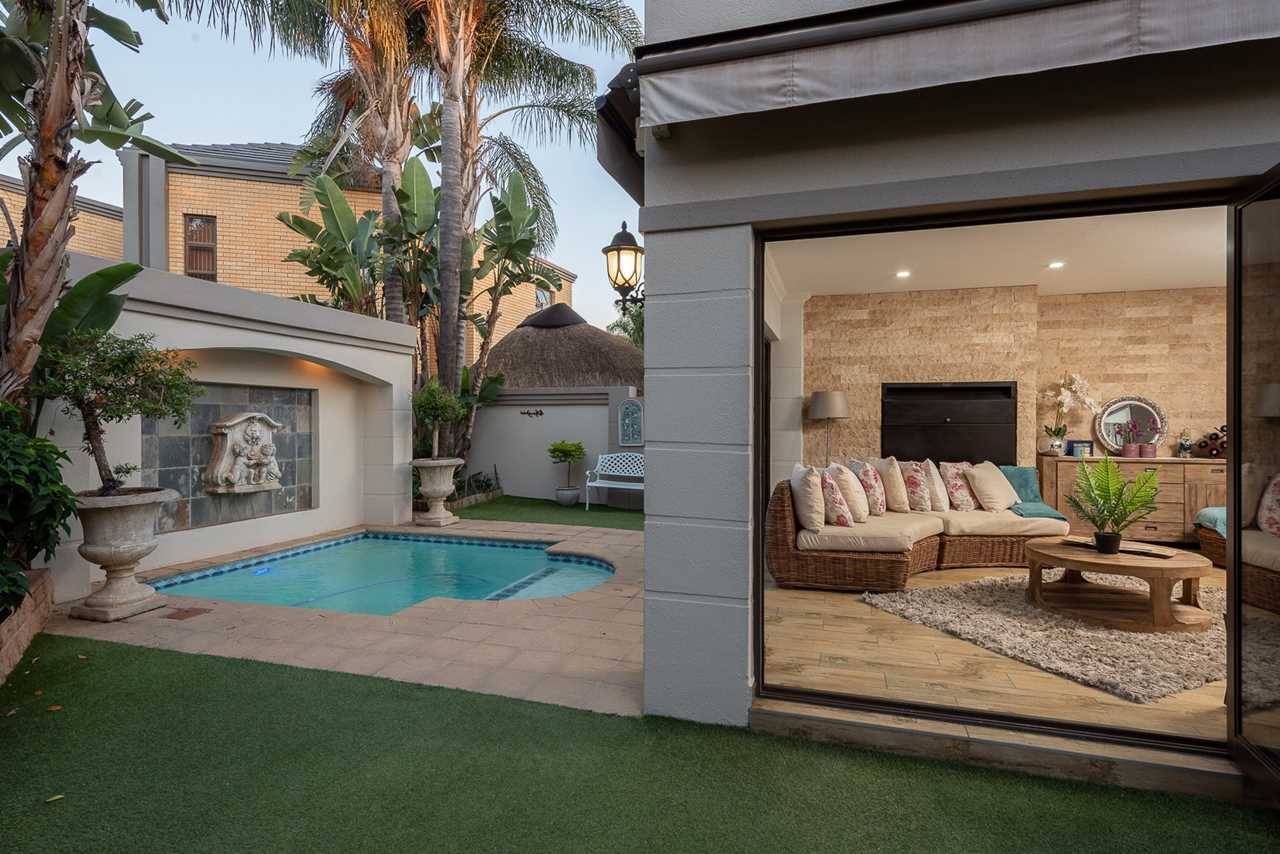 Double-volume entrance hall, elegant dining room with aircon, Large TV lounge with wallpaper feature, and an amazing enclosed sunroom/entertainment patio with built-in braai and stack doors opening to the pool.
