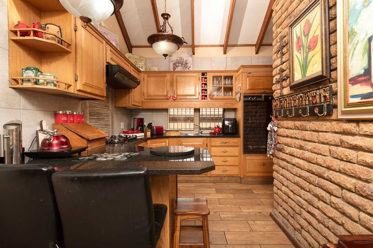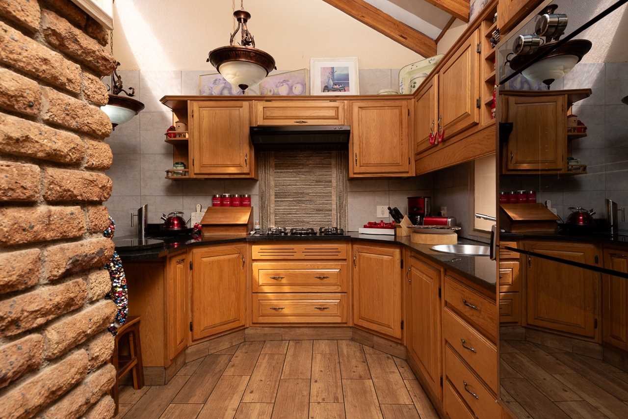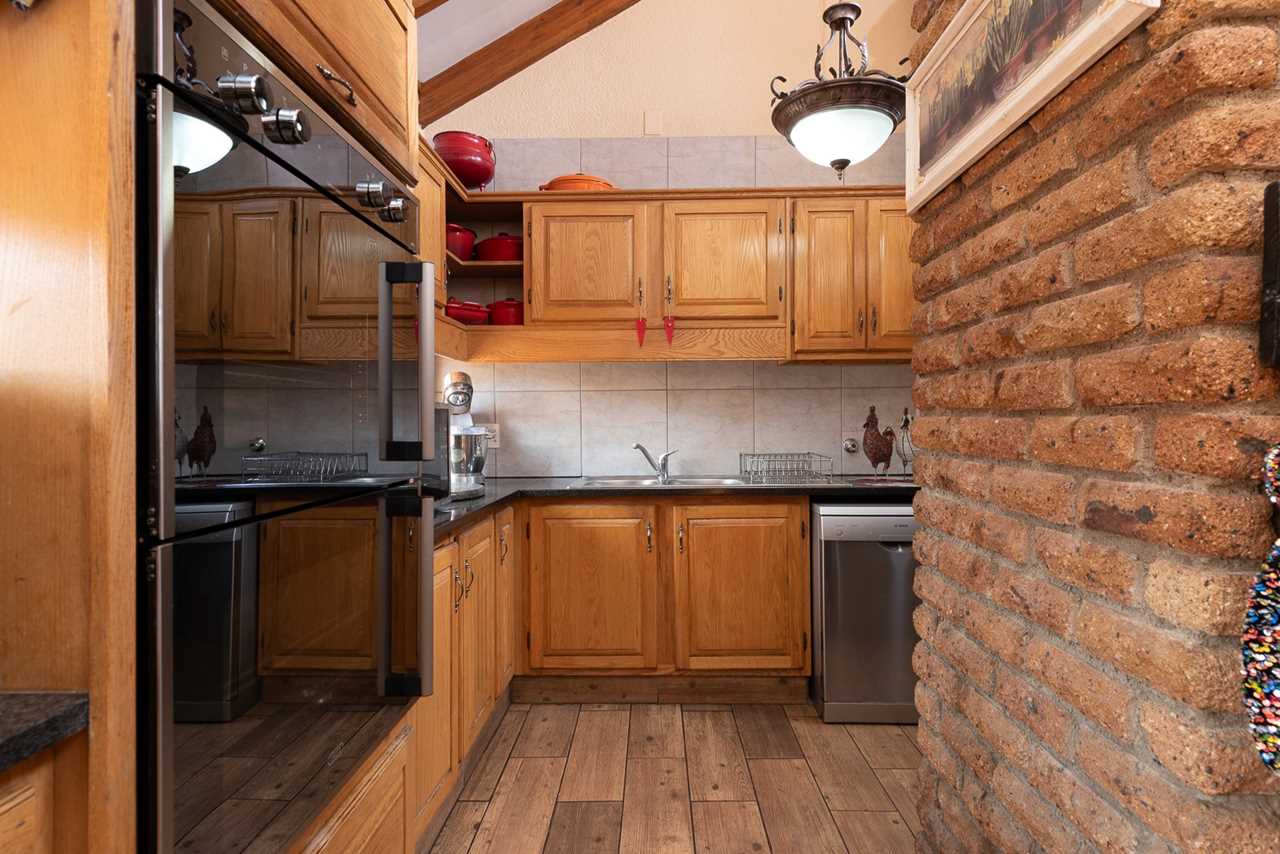 - Granite Kitchen – Solid wood cupboards, black granite tops, new eye-level oven, 5-plate gas stove, extractor fan and pantry.