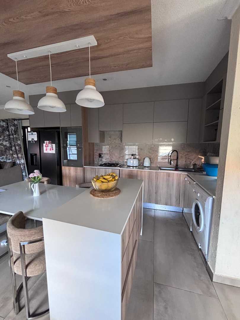The heart of the home is the open-plan, air-conditioned living area, seamlessly flowing into a modern kitchen fitted with a gas hob, eye-level oven, and built-in microwave—ideal for both everyday living and hosting guests.