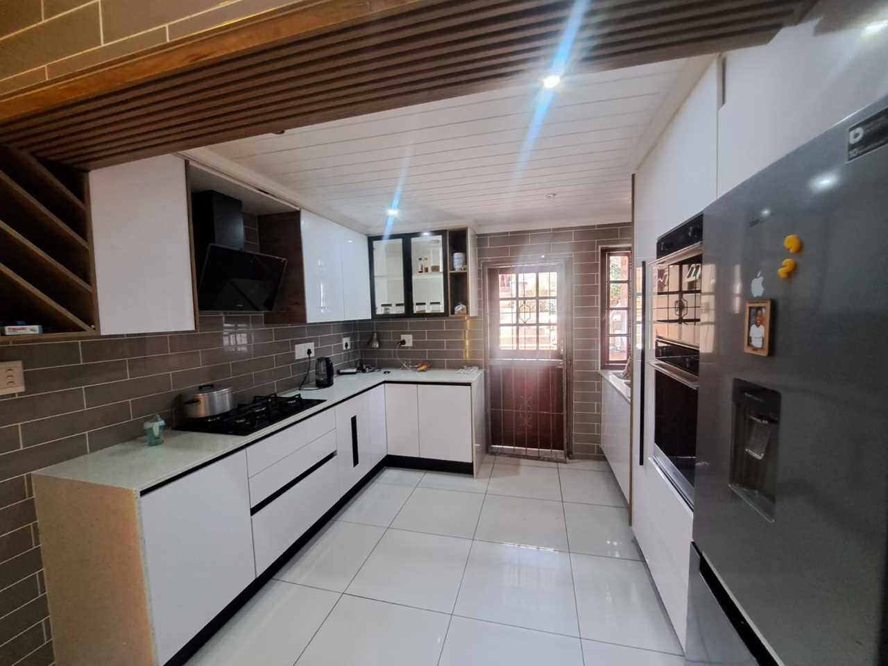 The home boasts a modern kitchen with gas stove, ample cupboard space, and a separate laundry room for added convenience. The main bedroom features a private en-suite bathroom, while the other bedrooms are spacious and ideal for family living.