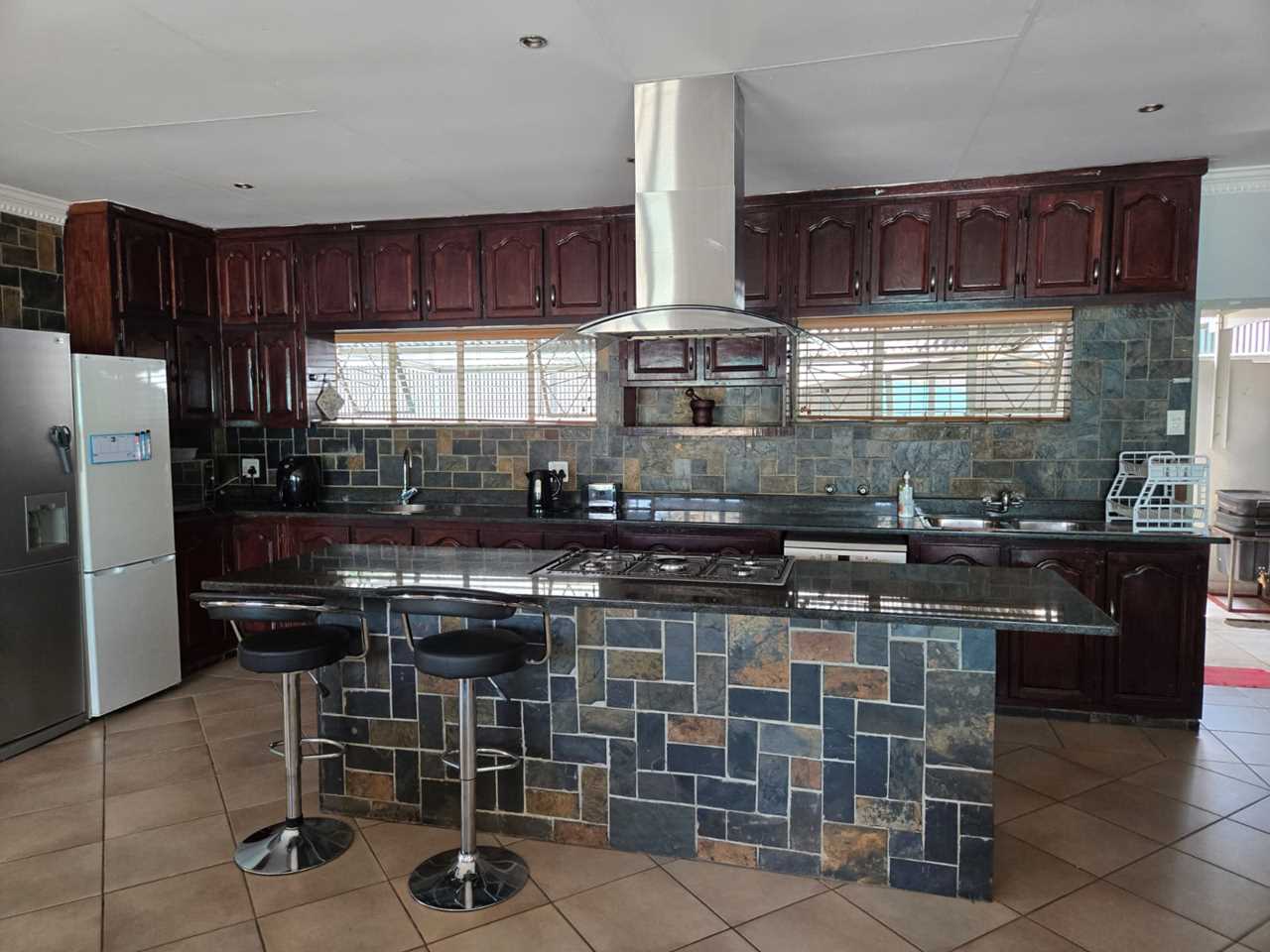 - Spacious open-plan kitchen with ample cupboards, island counter, and gas stove