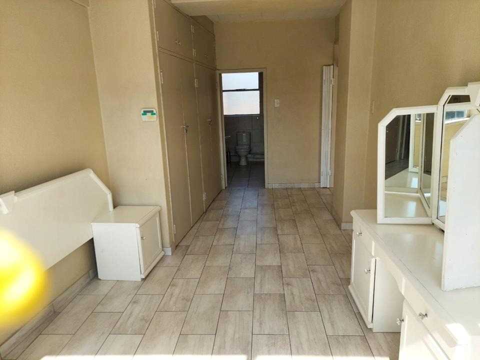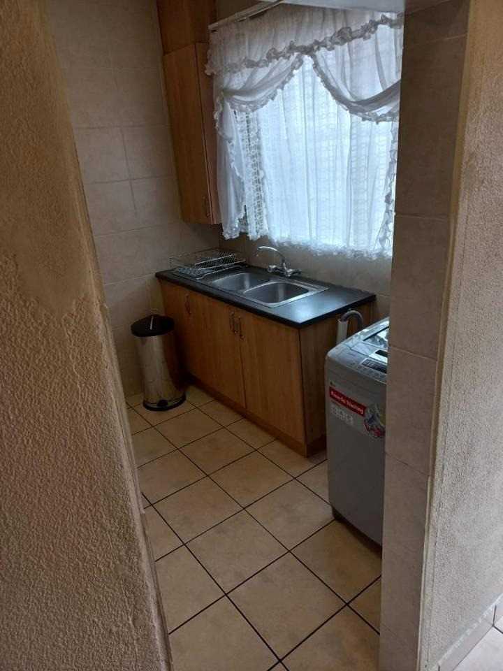 Step into a spacious lounge that welcomes natural light and leads to a well-fitted kitchen with ample cupboard space. The bedroom is generously sized with double built-in cupboards, while the neat bathroom includes a bath, basin, and toilet. The entire unit is tiled in a neutral cream tone for a clean, timeless look.