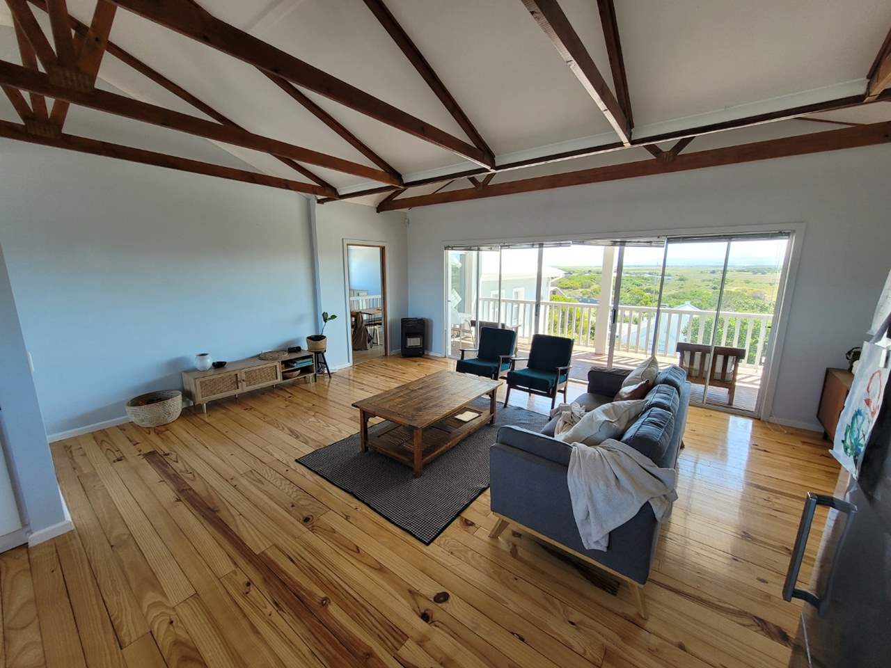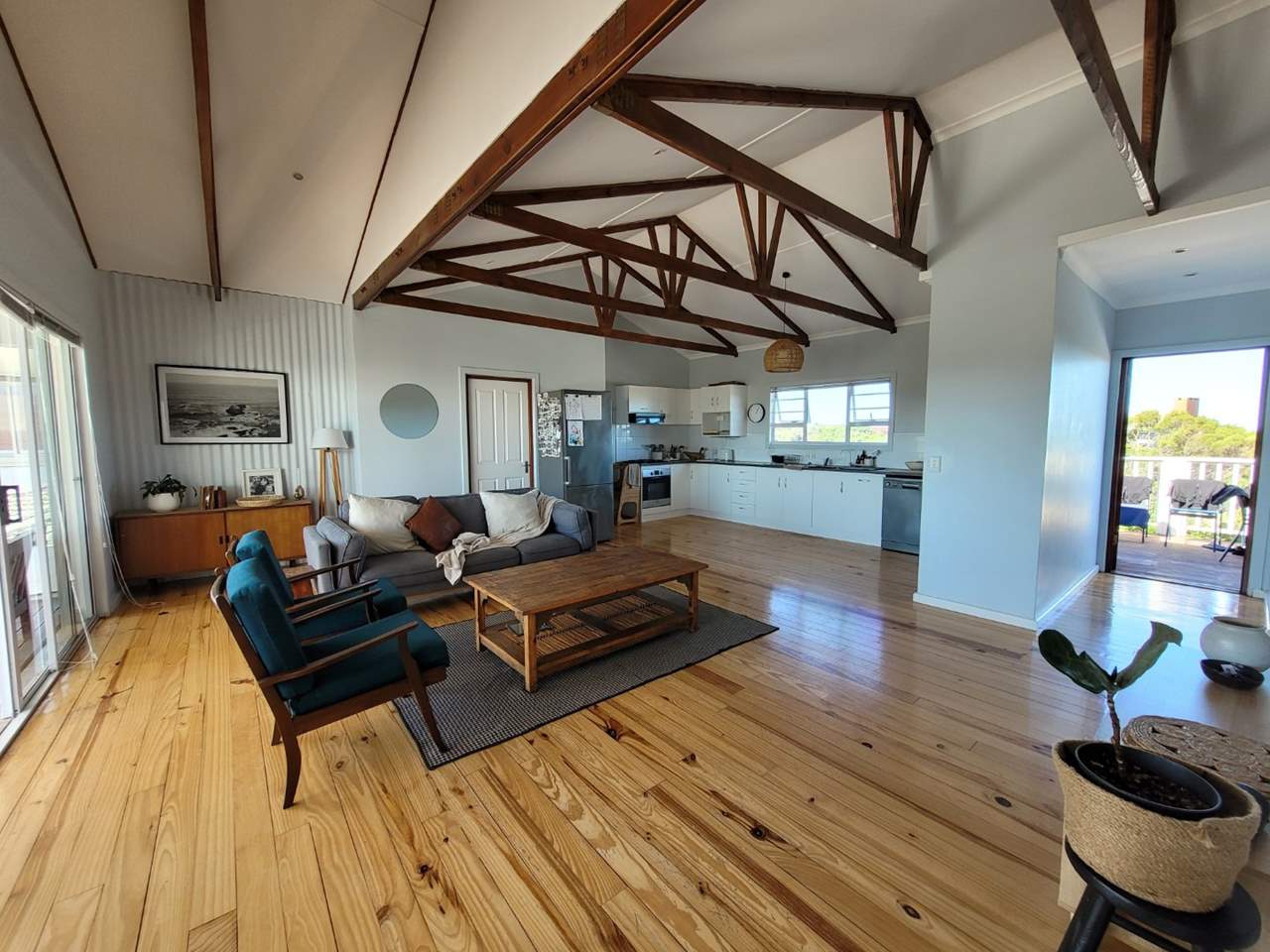 Open-plan lounge and kitchen with exposed trusses and beautiful wooden floors.