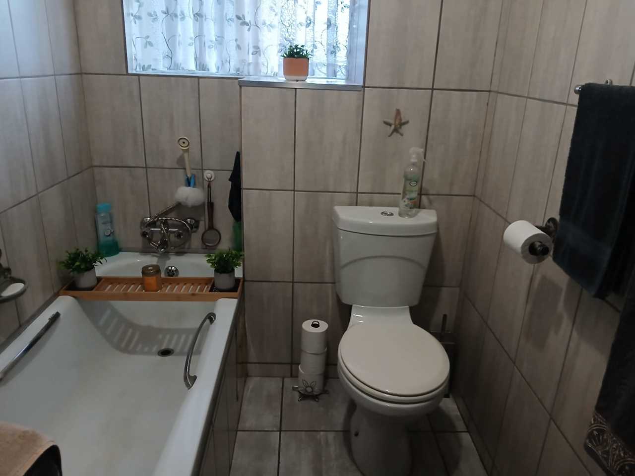 The unit features two well-sized bedrooms with built-in cupboards and a neat bathroom fitted with a bath, basin, toilet, and a washing machine connection.