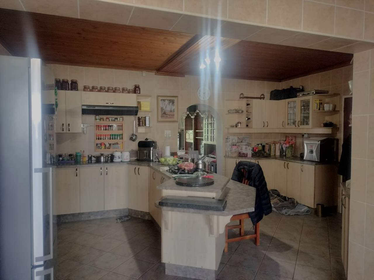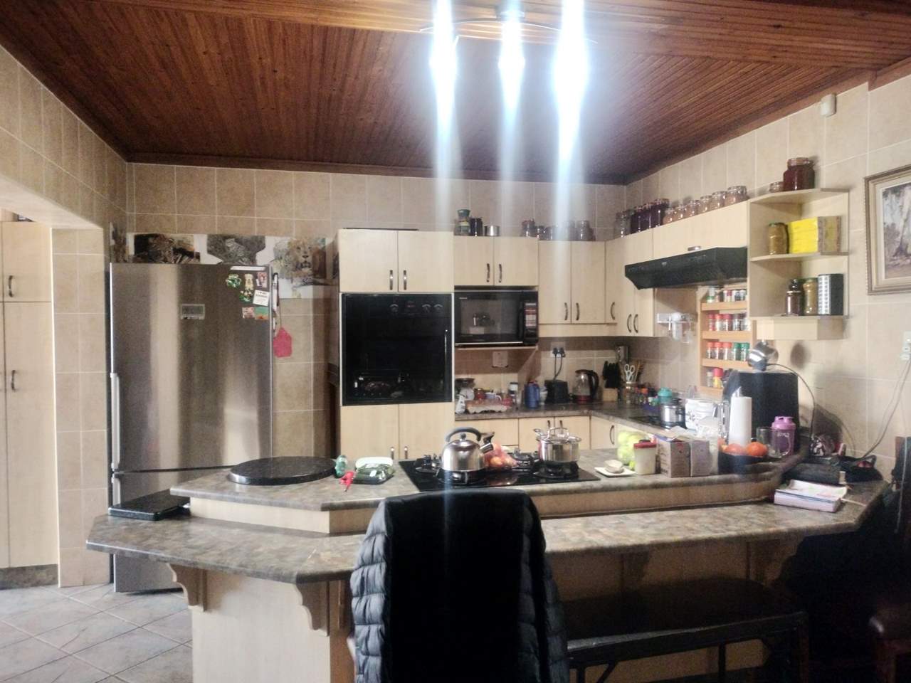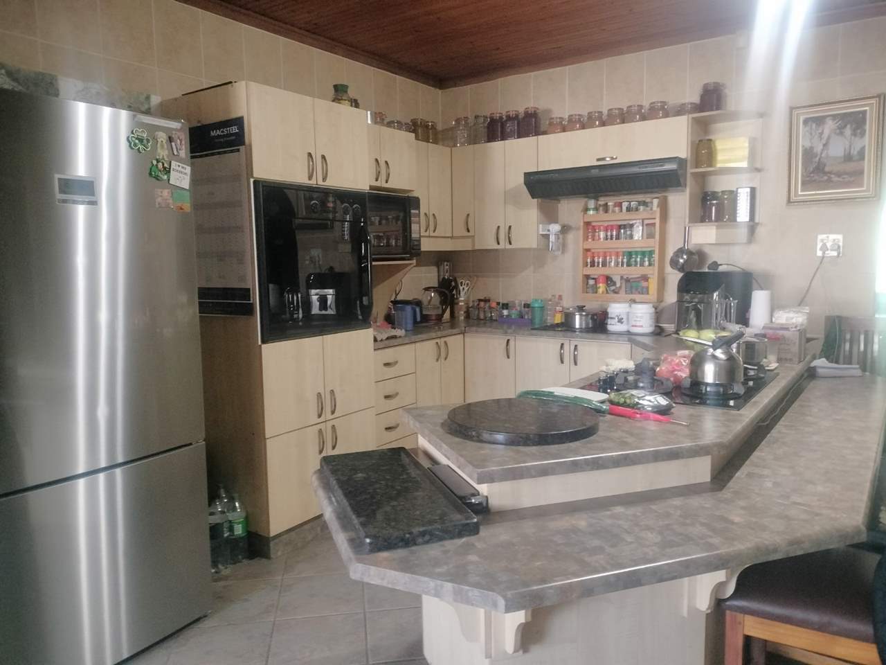 2nd house consists of 4 bedrooms (2 with full ensuite and an extra bathroom with shower, large kitchen with built-in cupboards, living room, double garage, laundry room, Lapa with built-in bar. Rental income R10 000.00 per month
