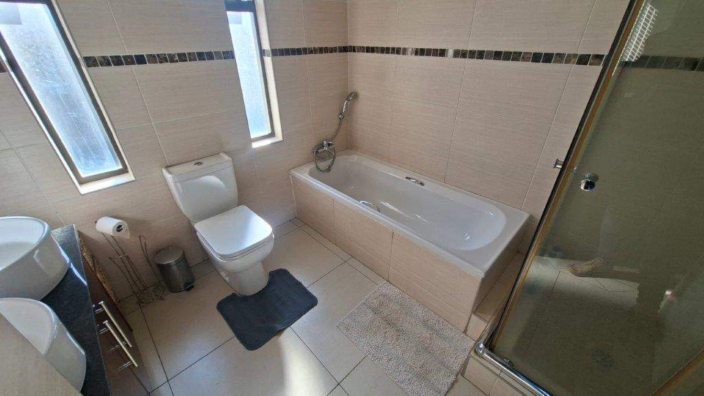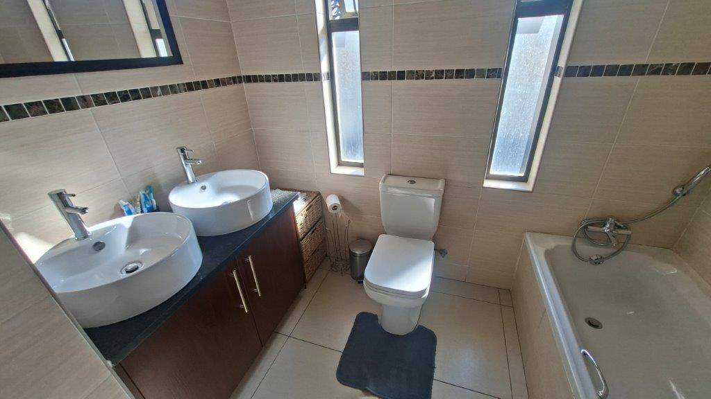 2 En-suite bathrooms with double basins, shower, bath, and toilet