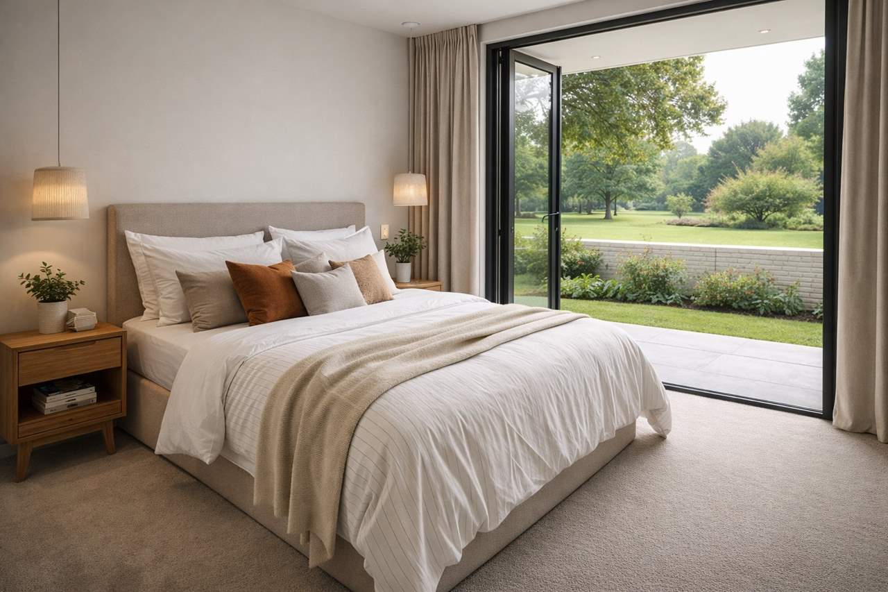 The home features three well-sized bedrooms, including a luxurious main en-suite with a full bathroom and walk-in cupboards. Sliding doors from the main bedroom lead to a private garden, while a full shared bathroom services the remaining bedrooms.