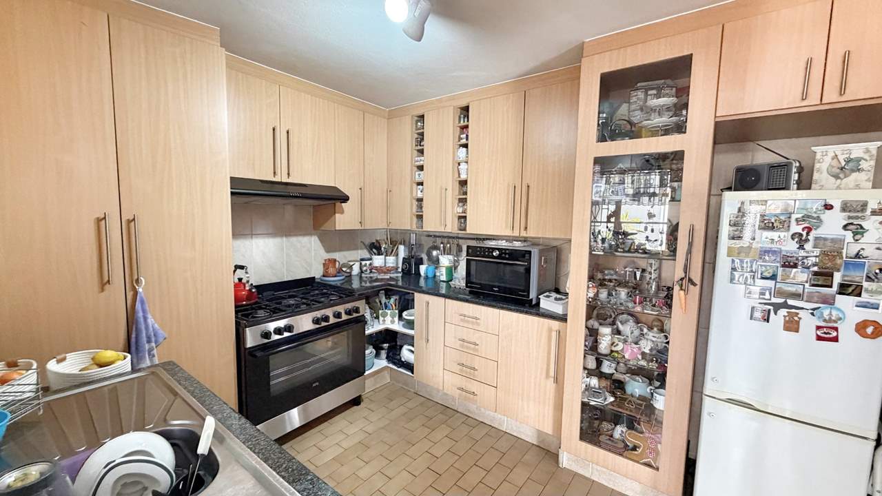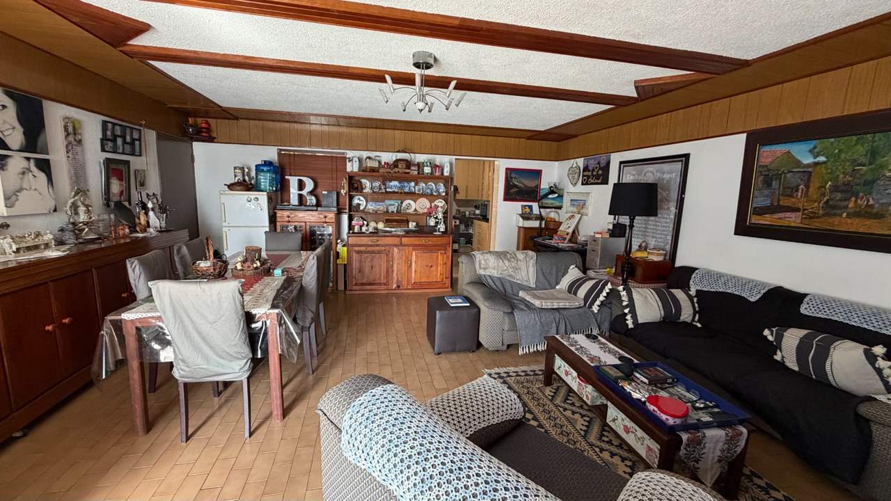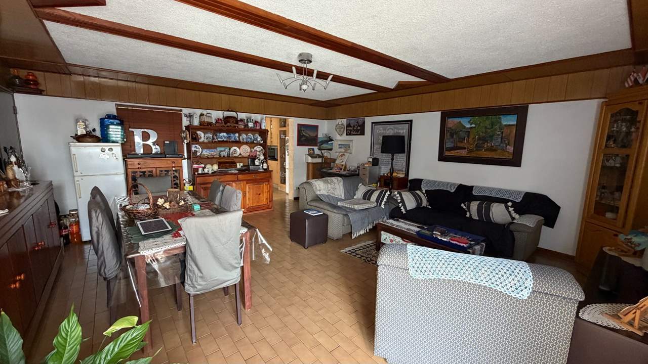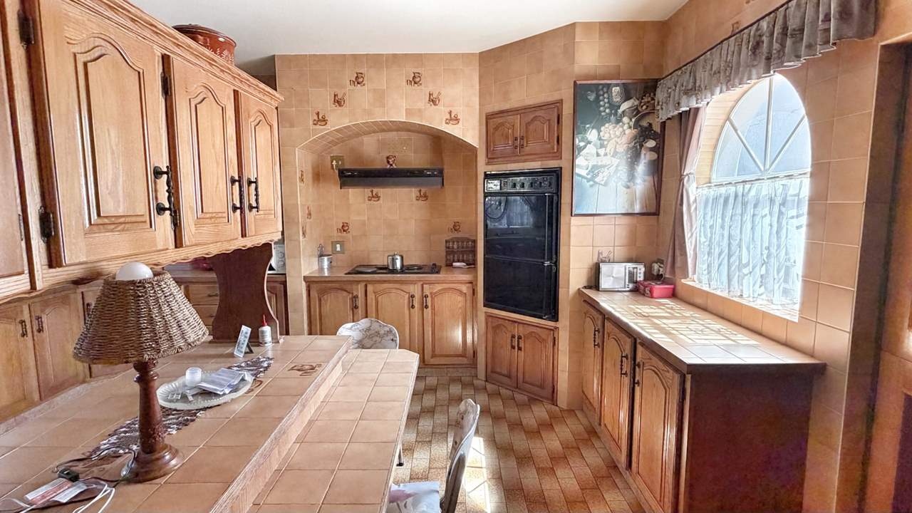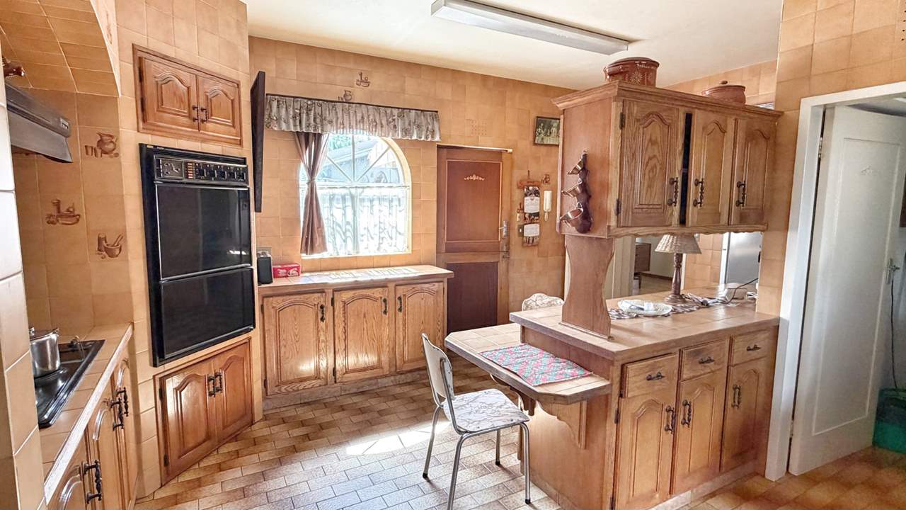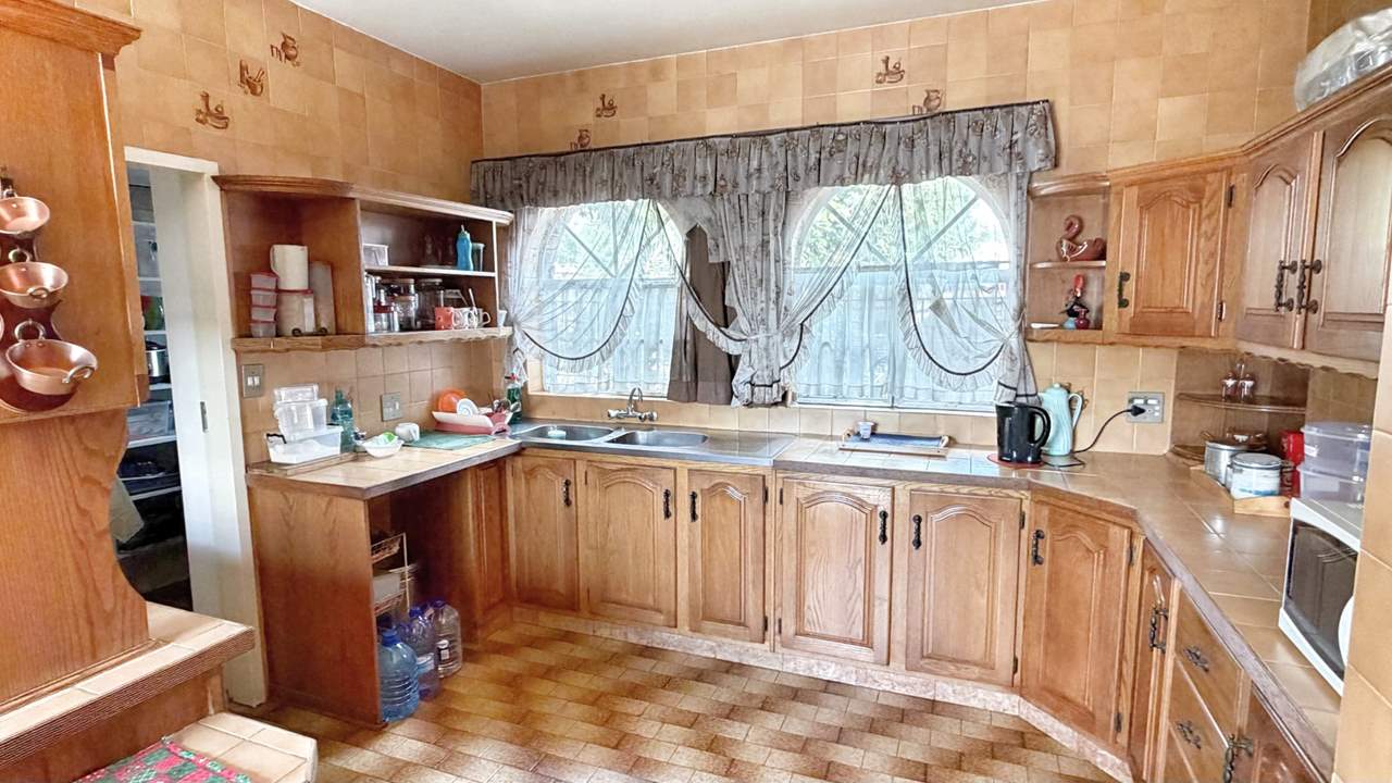The double-story main house welcomes you with a warm and inviting layout. Downstairs features a spacious lounge with fireplace, flowing onto an covered veranda—perfect for year-round enjoyment. The dining room is conveniently positioned alongside a large country-style kitchen fitted with solid oak built-in cupboards, hob, extractor fan, eye-level oven, breakfast nook, and pantry.