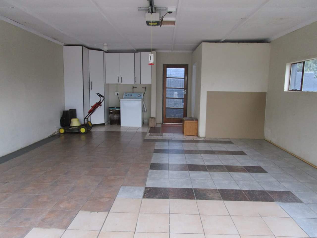 Double door garage with built ins for extra storage and a toilet for day guests.