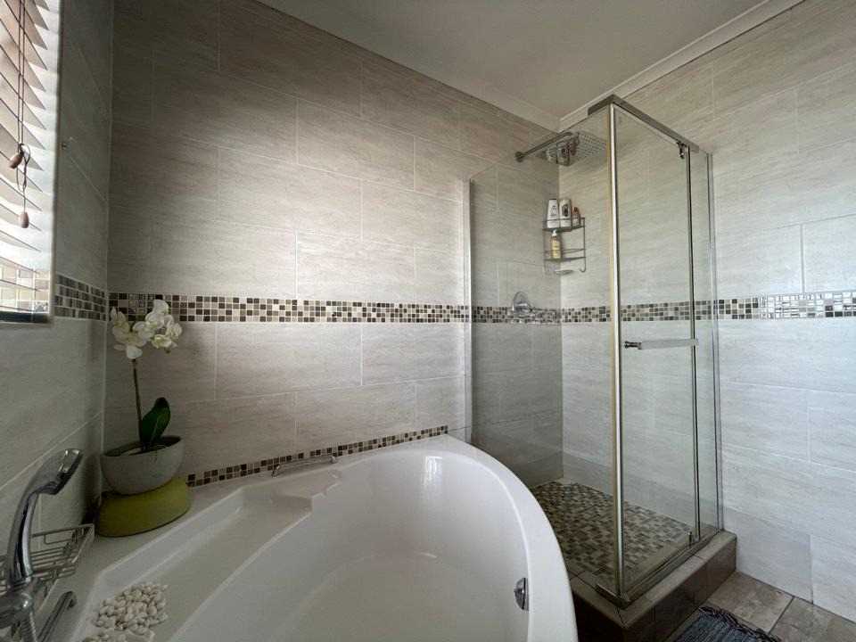 Accommodation includes three well-sized bedrooms with built-in cupboards. The main bedroom boasts a walk-in closet and luxurious full en suite bathroom, while the second bathroom serves as a modern family bath.