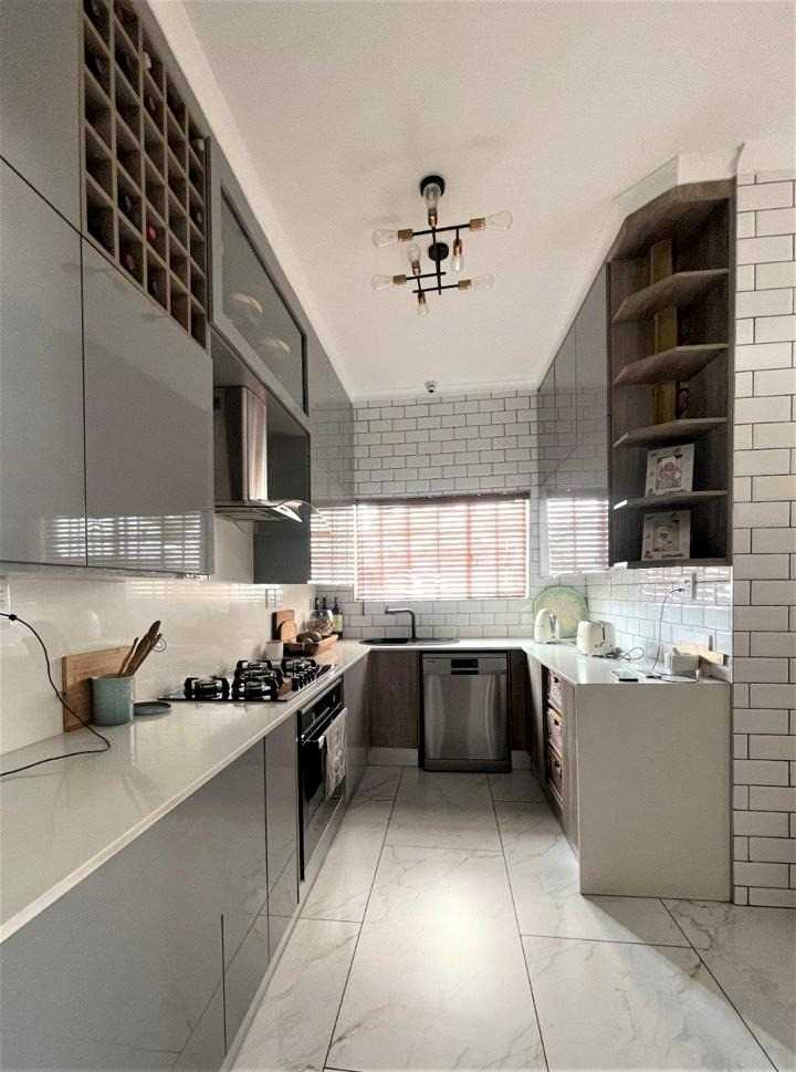 The kitchen has been designed with both style and practicality in mind. Featuring a mix of glossy and wood-tone cabinetry, Caesarstone countertops, and high-end appliances including: