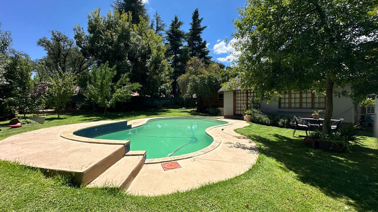 The property boasts a sparkling swimming pool, perfect for relaxing or entertaining, and is complemented by a beautiful, well-established garden with mature trees, creating a peaceful and tranquil setting.