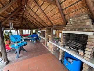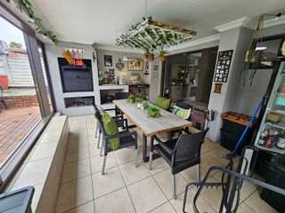 Sliding out from the kitchen, a wooden decked entertainment area awaits, complete with built-in braai, louvre doors, and a basin. This inviting space overlooks a sparkling pool and a neatly maintained garden, creating an ideal setting for relaxed outdoor living and memorable gatherings.