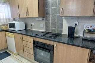 At the heart of the unit is a bright open-plan lounge and modern kitchen, creating a welcoming space for both daily living and relaxed entertaining. The kitchen is fitted with granite countertops, an under-counter oven, electric hob, and space for both a washer and dryer. A breakfast nook adds both charm and functionality, neatly defining the living area.